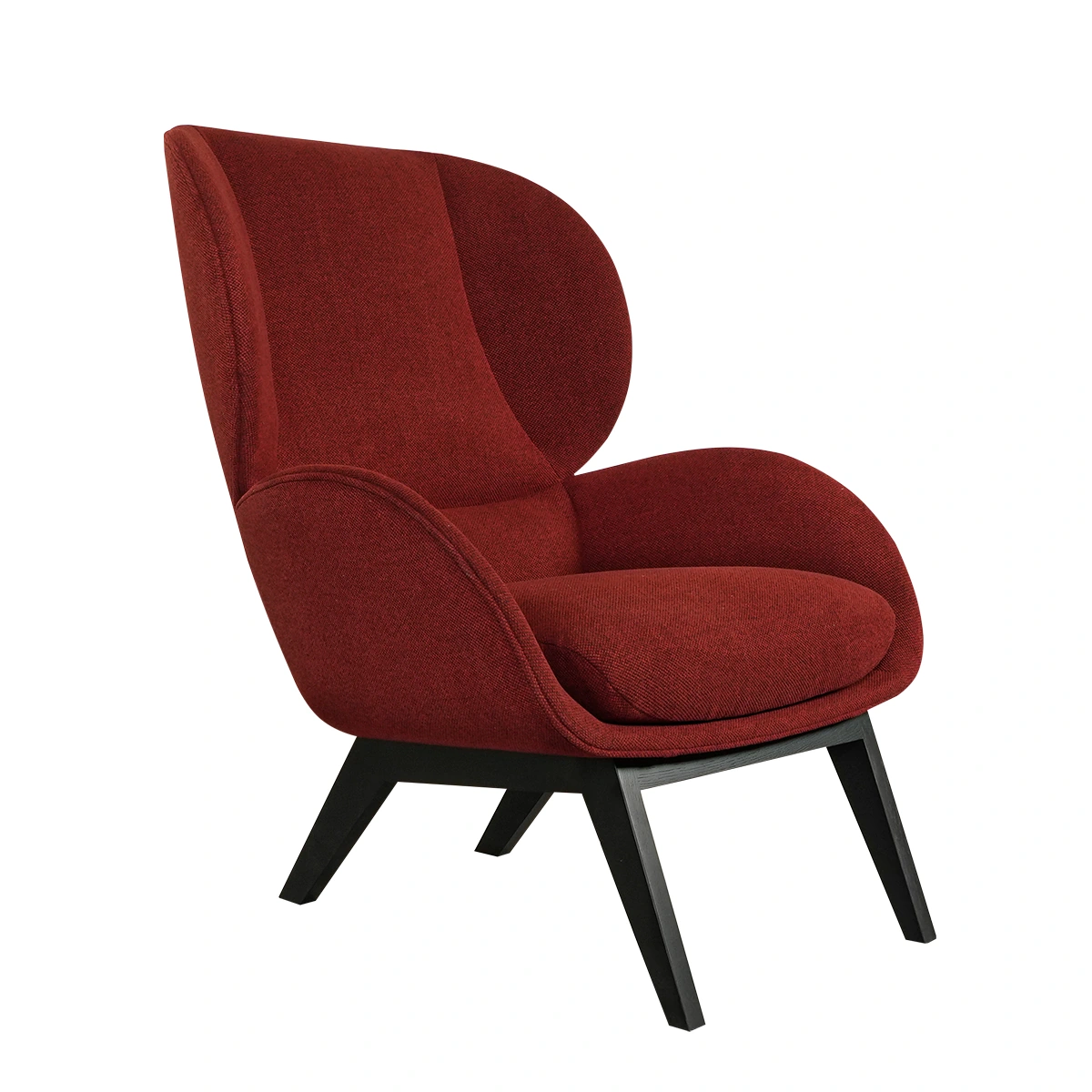 Adria Longue Chair in wine red is a fabric lounge chair designed for extended relaxation and elegant accent seating. Its elongated form makes it ideal for reading corners and stylish living rooms. Constructed with HR foam and soft wadding, the chair provides supportive comfort. The structure combines a metal frame and plywood, supported by black painted oak legs. Dimensions: L 90 cm, W 79 cm, H 99.5 cm.