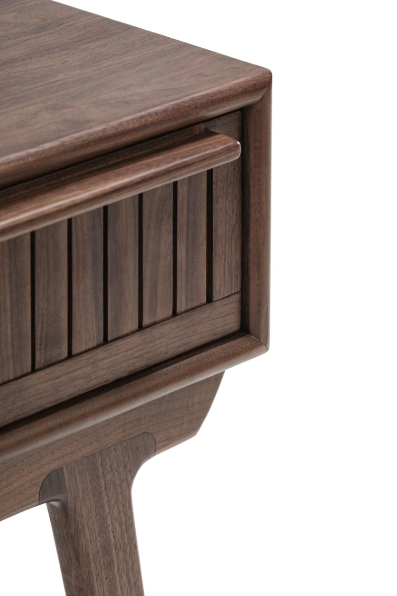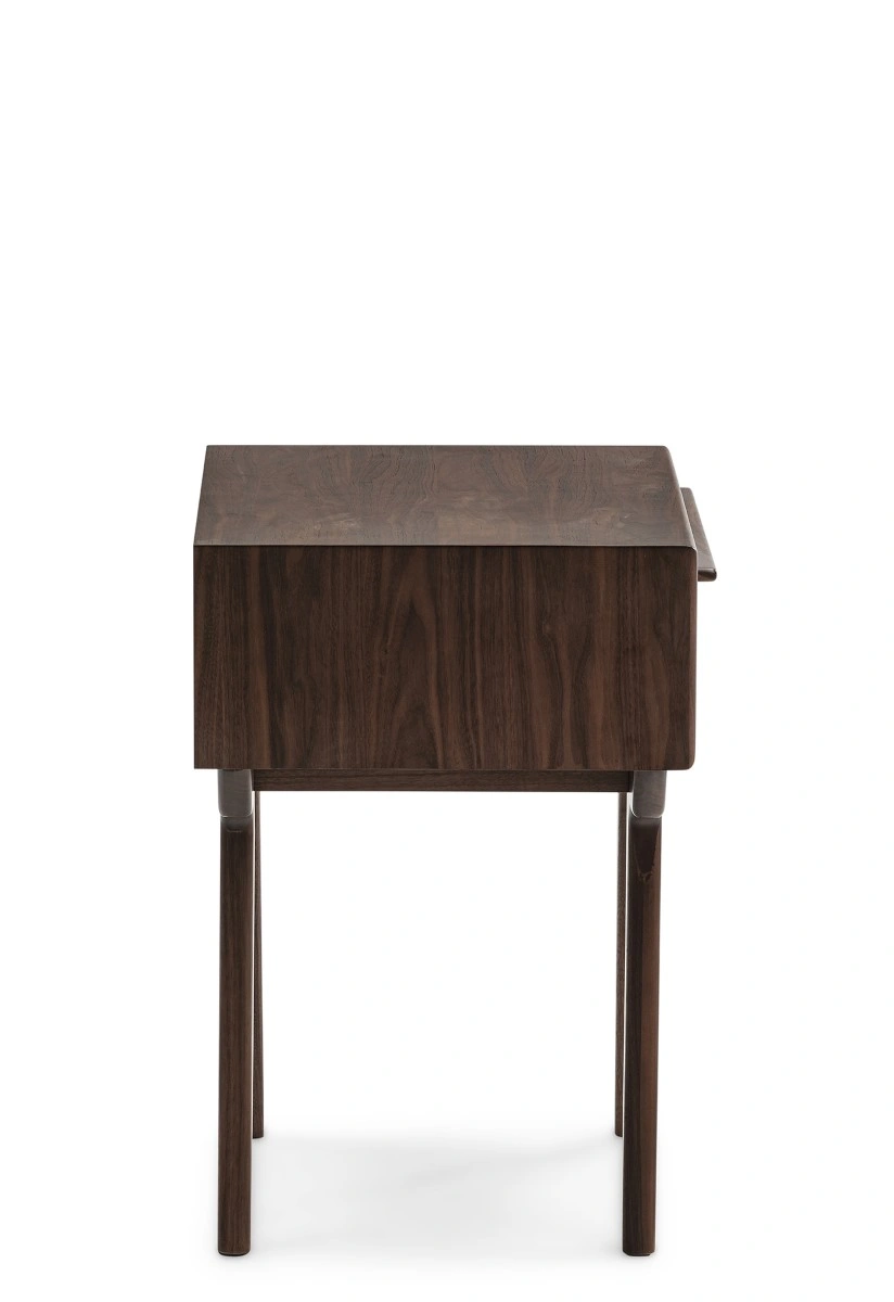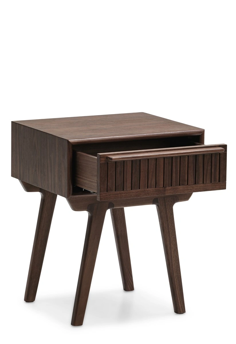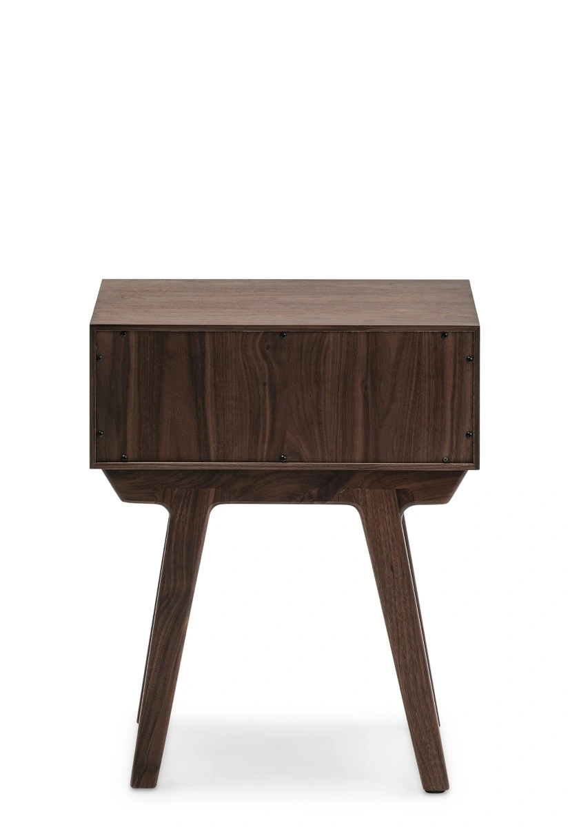 Crafted from rich walnut, the Alaska Nightstand combines style and function. With one drawer and an open shelf, it adds warmth and practicality to modern spaces. It pairs well with natural fabrics and light wood tones for a cozy bedroom.