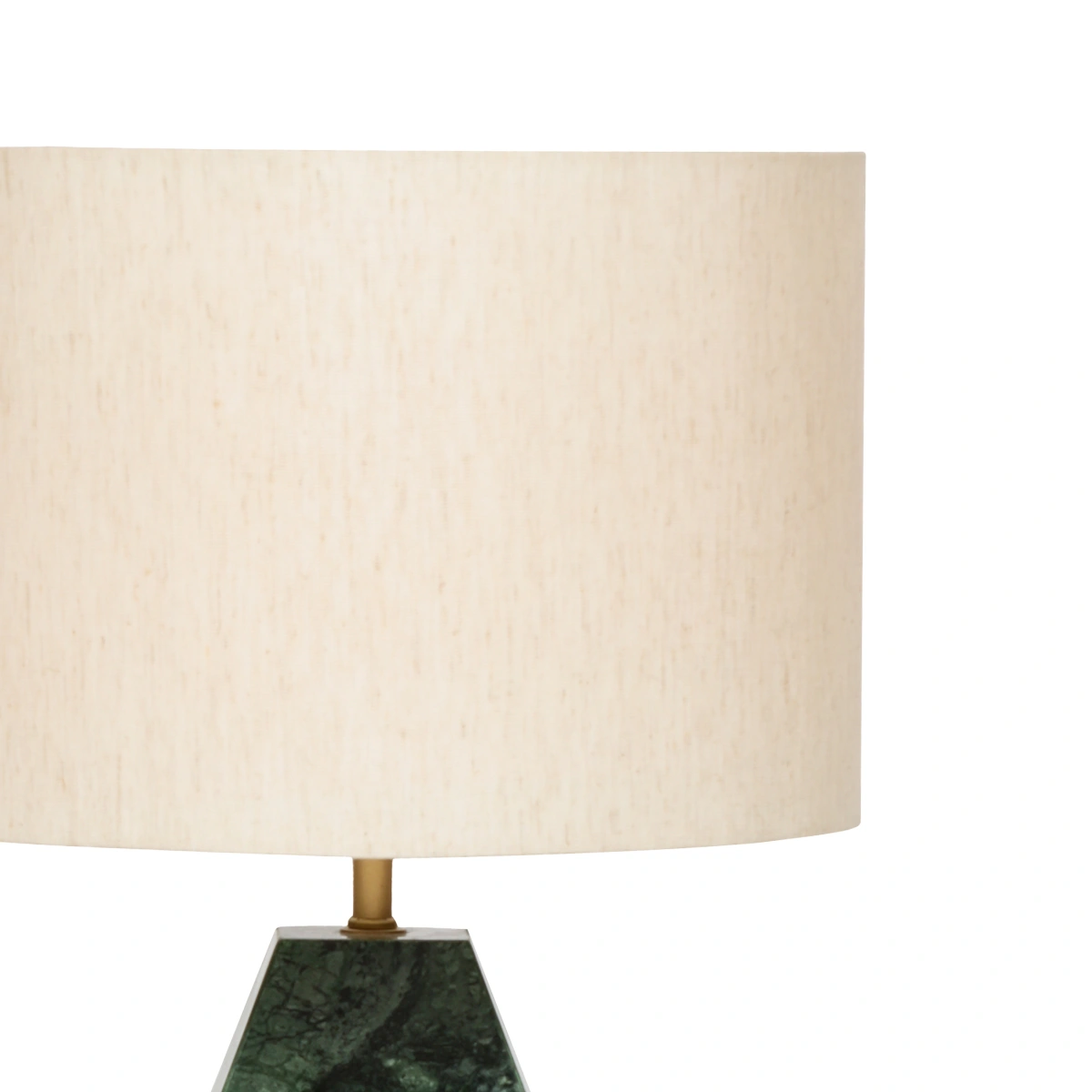Base: Natural K Green Marble (Polished Surface); Frame: Mild Steel (Gold Finish); Shade: Cotton Linen Fabric (Soft Diffuser)