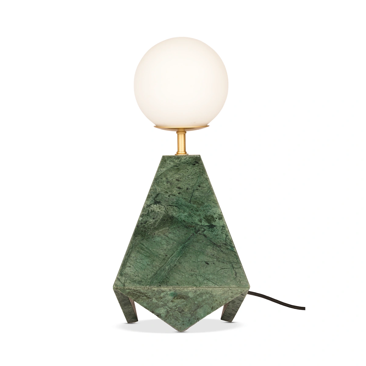 Base: Natural K Green Marble (Polished Surface); Frame: Mild Steel (Gold Finish); Shade: Milky White Glass Ball (Soft Diffusion)
