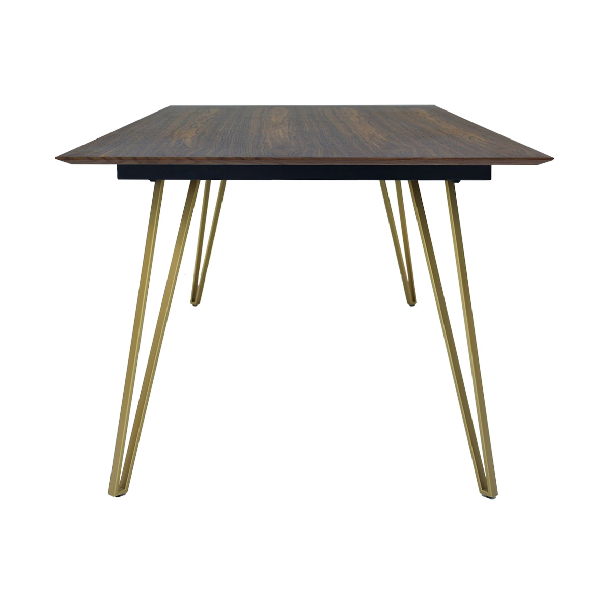 This modern dining table features a spacious 200 cm by 100 cm surface, perfect for seating 6–8 guests comfortably. Crafted with an MDF core and walnut veneer finish, it is supported by a sturdy gold-colored steel base. The harmonious blend of materials and clean lines suit both formal dining rooms and casual spaces.