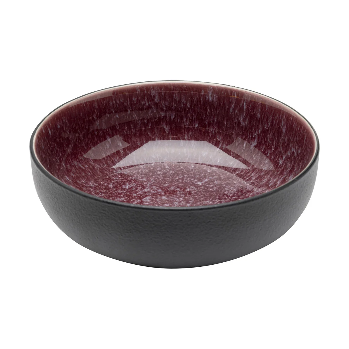 Key features of this 16cm bowl include a harmonious interplay of deep dark red and fine, white speckled details, and an outer coat of deep black with a matte finish. Each bowl is crafted from high-quality, glazed stoneware and hand-made, ensuring each piece is unique.