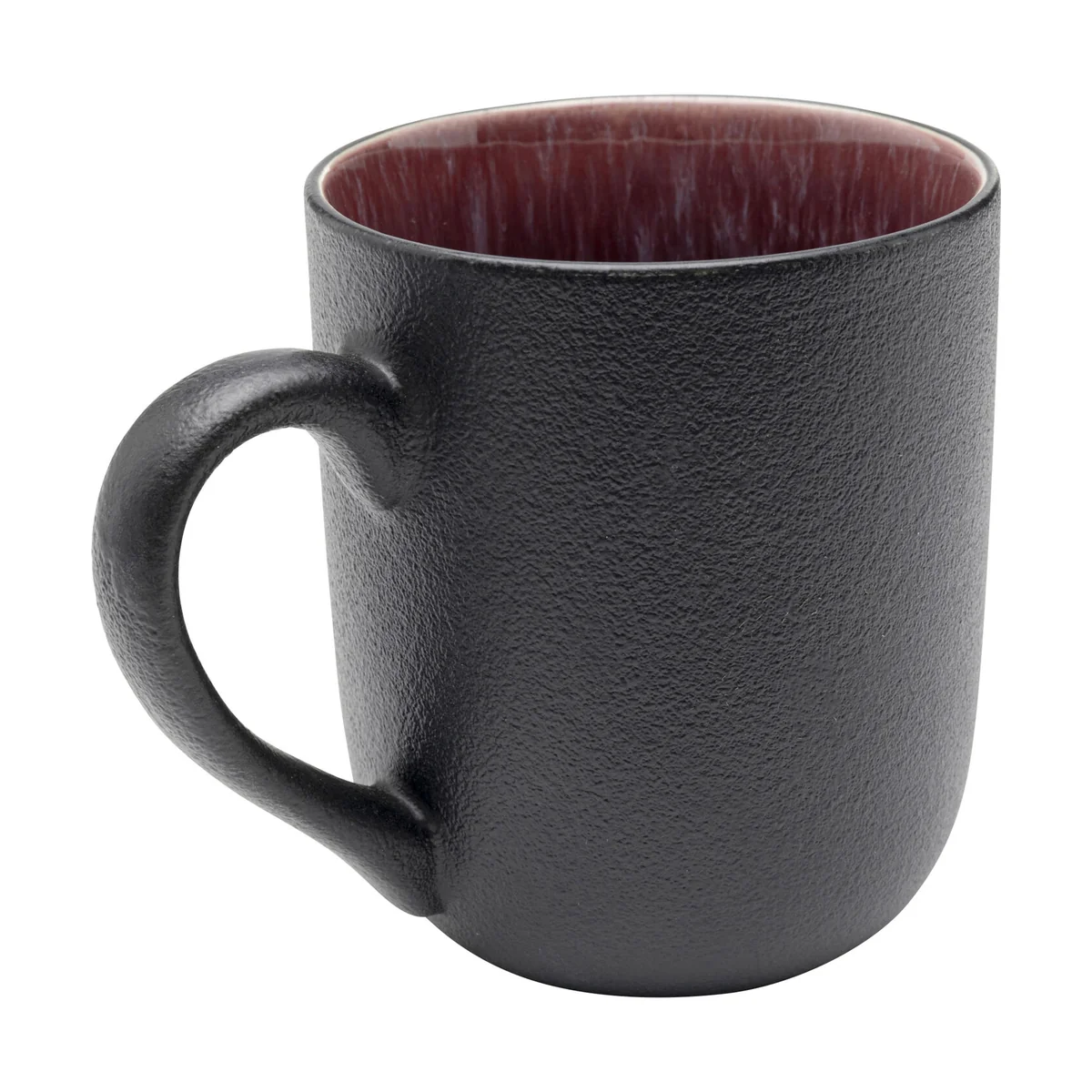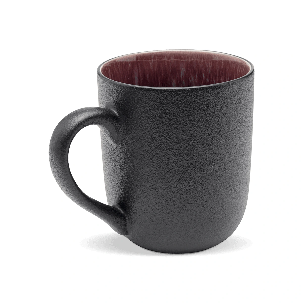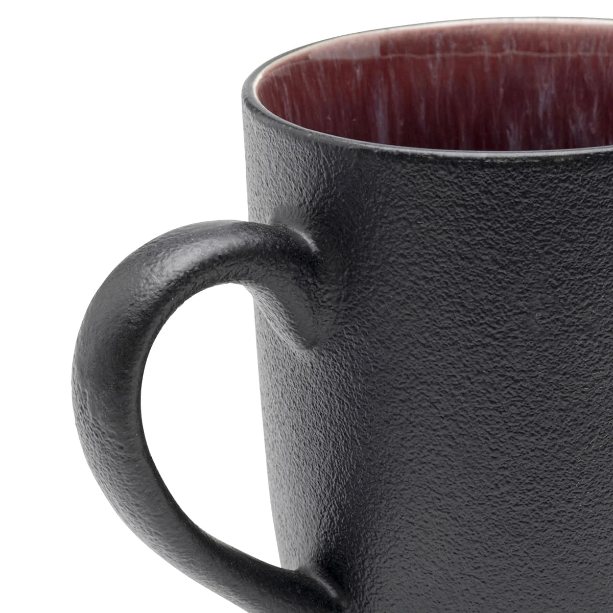 Standing at 11cm high and measuring 9cm in diameter, this ceramic mug impresses with its velvet-like deep black exterior and delicate red speckles. Handcrafted with care, it boasts an authentic ceramic feel and a modern matte finish.