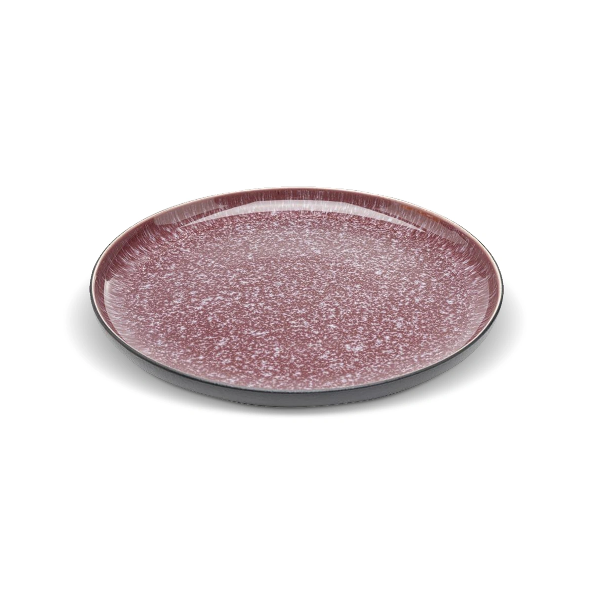 The large ceramic plate, measuring 2.6 x 27 x 27 cm, showcases a harmonious interplay of deep dark red and fine white speckled details. The exterior boasts a plain black matte finish, adding a modern touch to the overall design. Each piece is a unique creation, handcrafted from high-quality glazed ceramic.