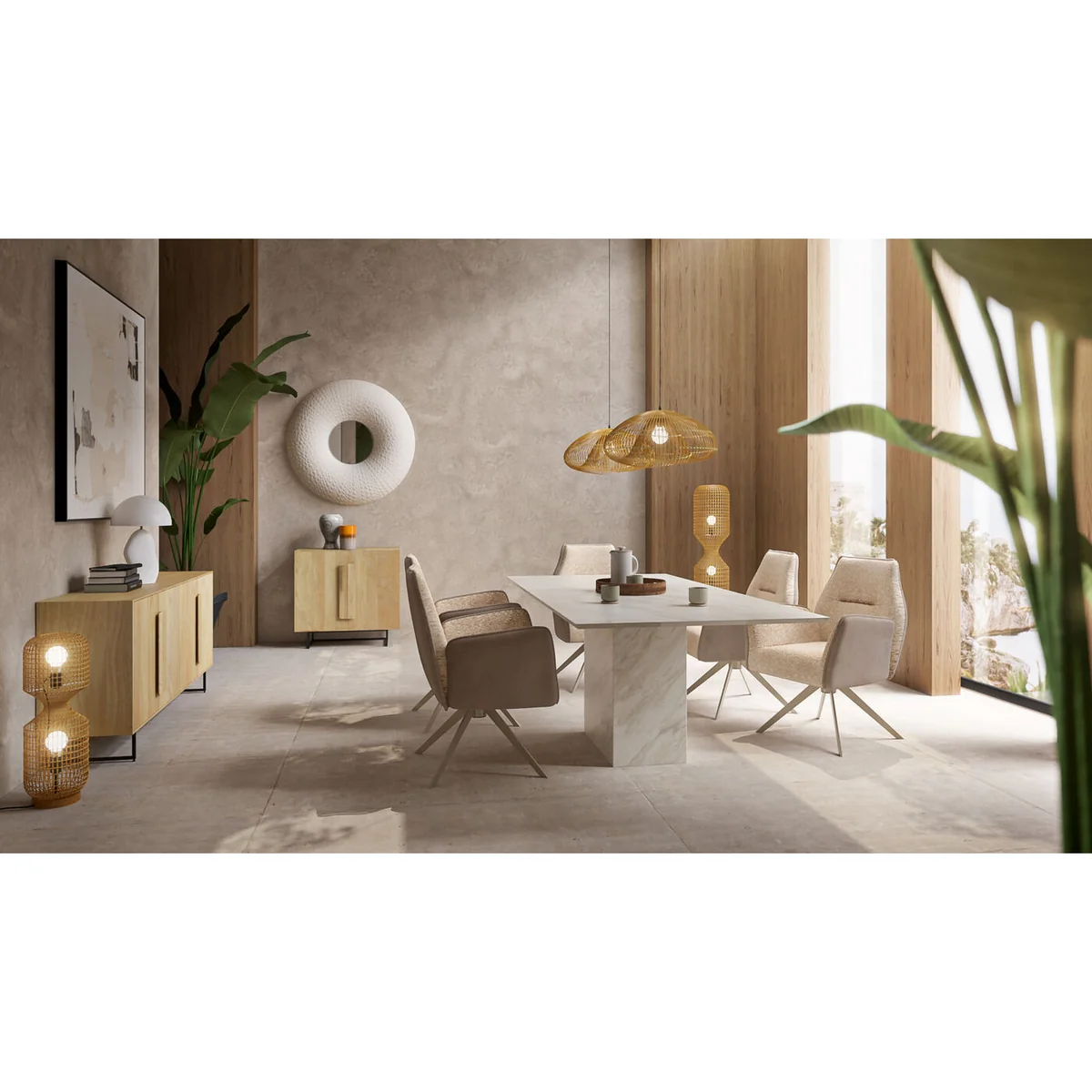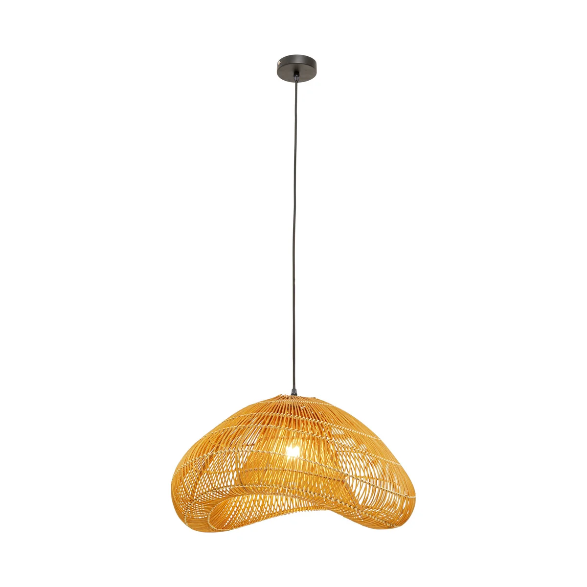 The Aloha Drop Uno Pendant Lamp is handcrafted with a rattan shade, measuring 30.5 x 52 x 54 centimeters. Its organic shape and aesthetic appearance blend seamlessly with modern, Scandinavian, or boho-inspired interiors. The airy design is ideal for spaces that aim for a light and harmonious aesthetic.