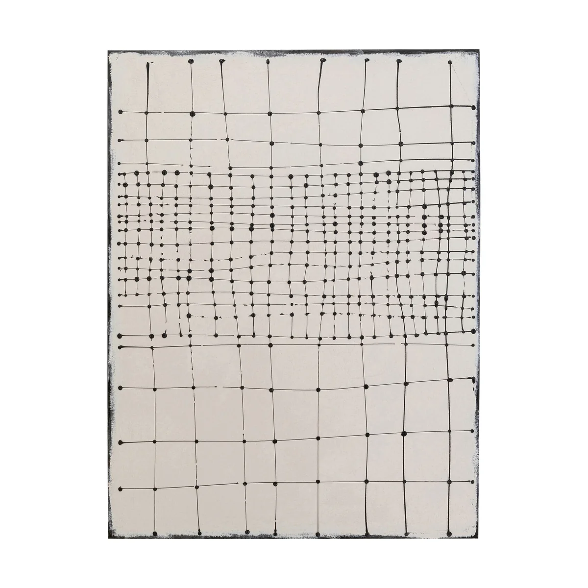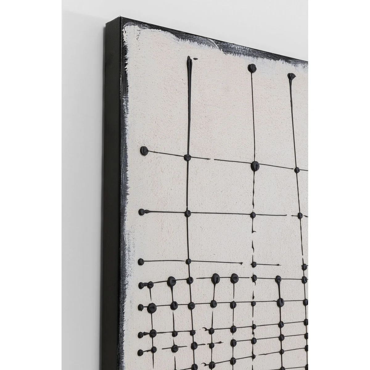 This modern canvas painting showcases an abstract composition accented in black, providing a unique contrast against the beige background. Sized at 120 x 90 x 3.8 cm, this Alvio canvas picture is made of high-quality cotton canvas and acrylic paint, with a pine solid wood back panel for added durability.