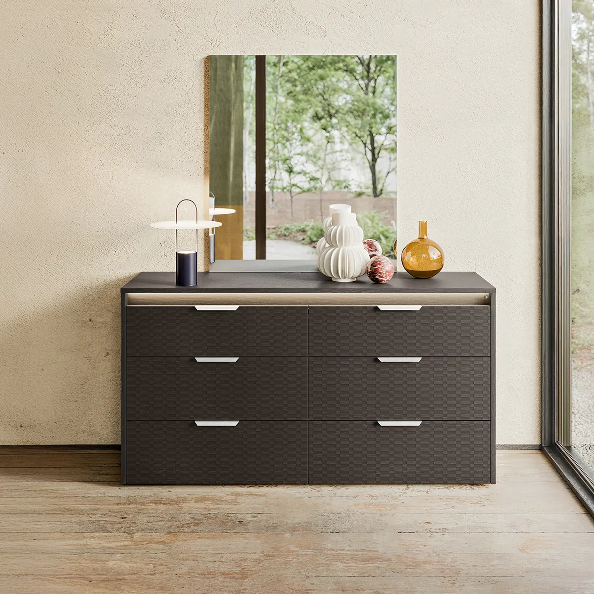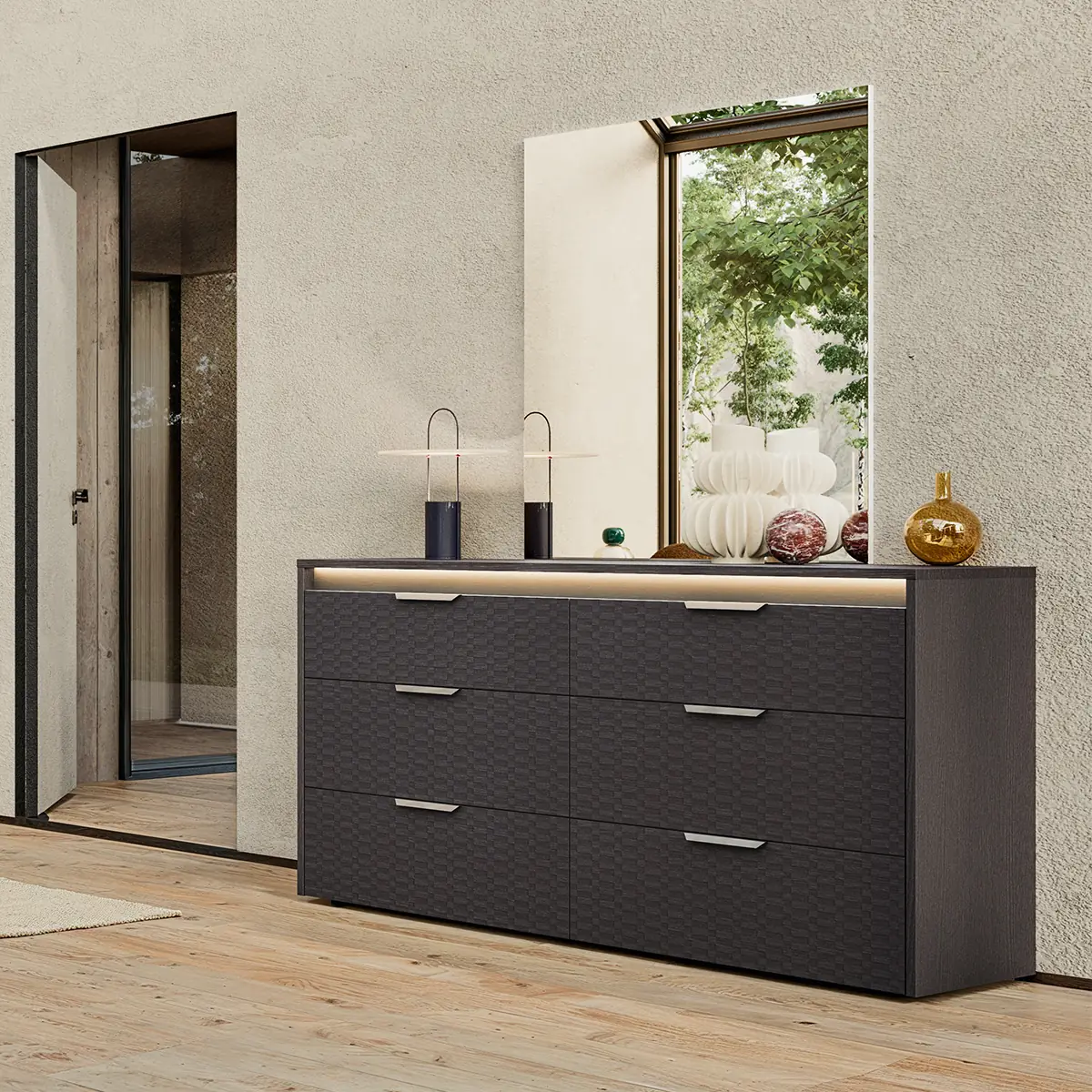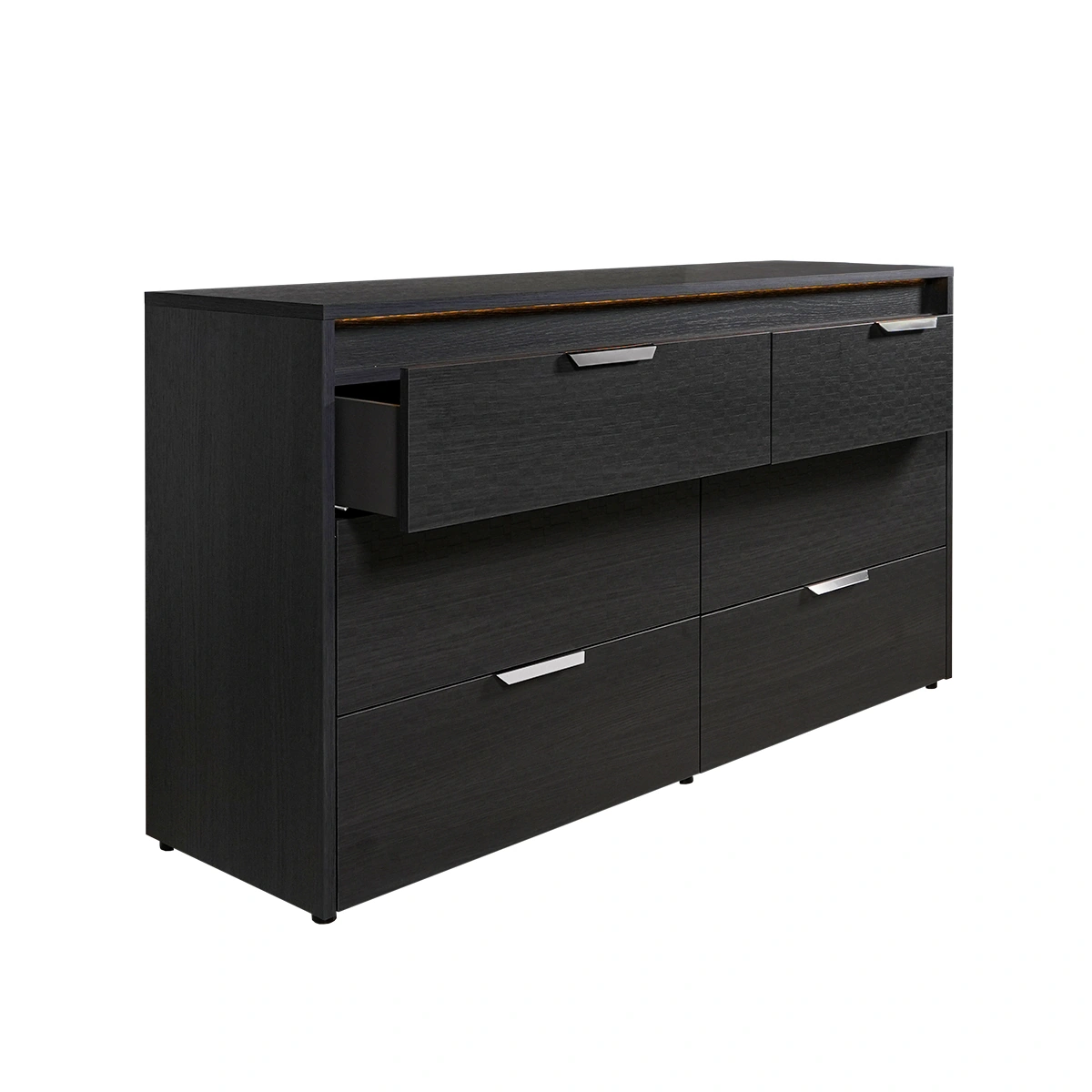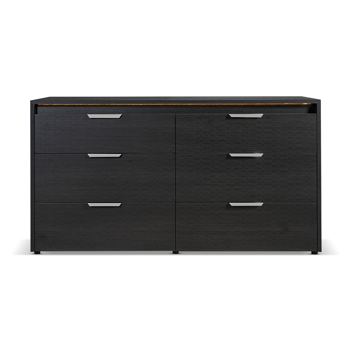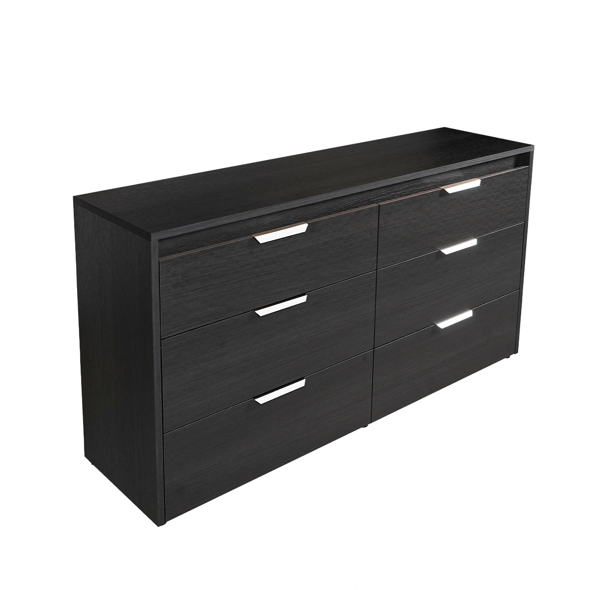 The Amy 6 Drawer Dresser in Eco Dark Oak is a modern storage solution designed for organized and stylish bedrooms. This dresser combines generous storage capacity with a sleek design, making it ideal for contemporary living spaces that prioritize functionality and elegance. Constructed from high-quality melamine with a Tetris matte finish, the dresser features six spacious drawers and integrated lighting for enhanced visibility and modern appeal. Its solid structure ensures durability, while the refined finish adds a polished look to bedroom interiors. This dresser offers everyday convenience with ample storage for clothing and essentials. Integrated lighting enhances usability, while the clean design elevates bedroom organization, making it a smart and stylish investment for long-term use.