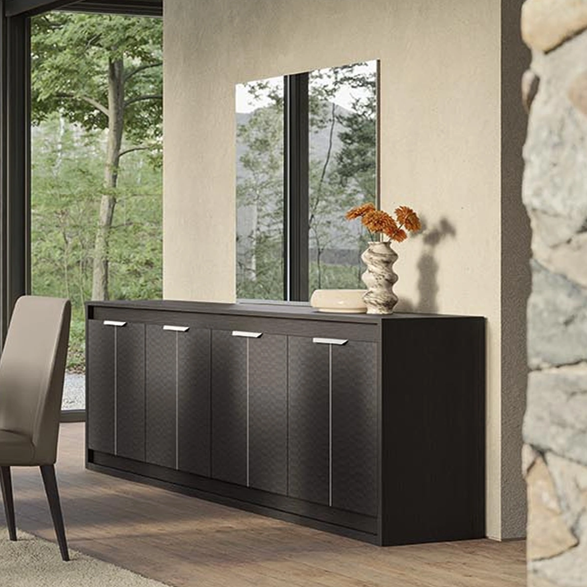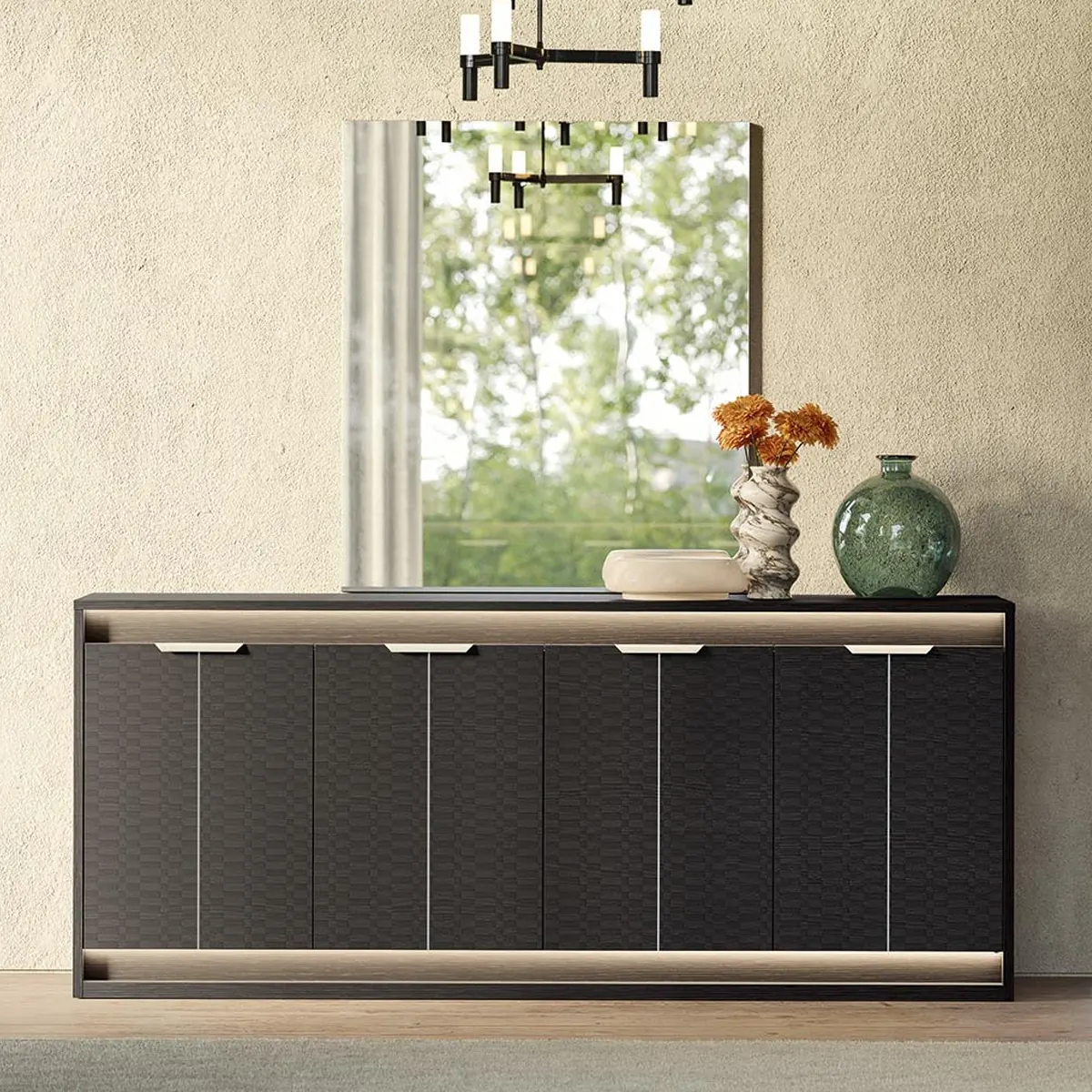The Amy Buffet in Eco Dark Oak is a refined storage solution designed for modern living and dining spaces. With its sleek profile and integrated lighting, this buffet adds both visual interest and practical storage to contemporary interiors. Crafted from durable melamine with a Tetris matte finish, the buffet features four doors and integrated interior lighting for enhanced functionality. Its spacious interior supports organized storage while maintaining a clean exterior look. This buffet combines elegance with everyday convenience. Integrated lighting improves visibility, while the sturdy construction ensures long-lasting performance, making it an ideal addition for stylish and organized homes.