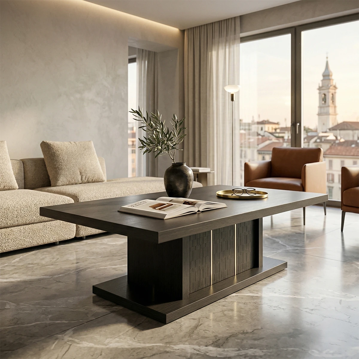 The Amy Coffee Table in Eco Dark Oak is a modern living room essential designed to anchor seating areas with understated elegance. Its clean, rectangular form suits contemporary interiors while offering a practical surface for everyday use. Made from durable melamine with a Tetris matte finish, the coffee table features a stable structure and a smooth Eco Dark Oak surface. Its balanced proportions make it ideal for both compact and spacious living rooms. This coffee table delivers style and functionality in equal measure. Easy to maintain and visually versatile, it provides a dependable centerpiece that complements sofas and seating arrangements effortlessly.