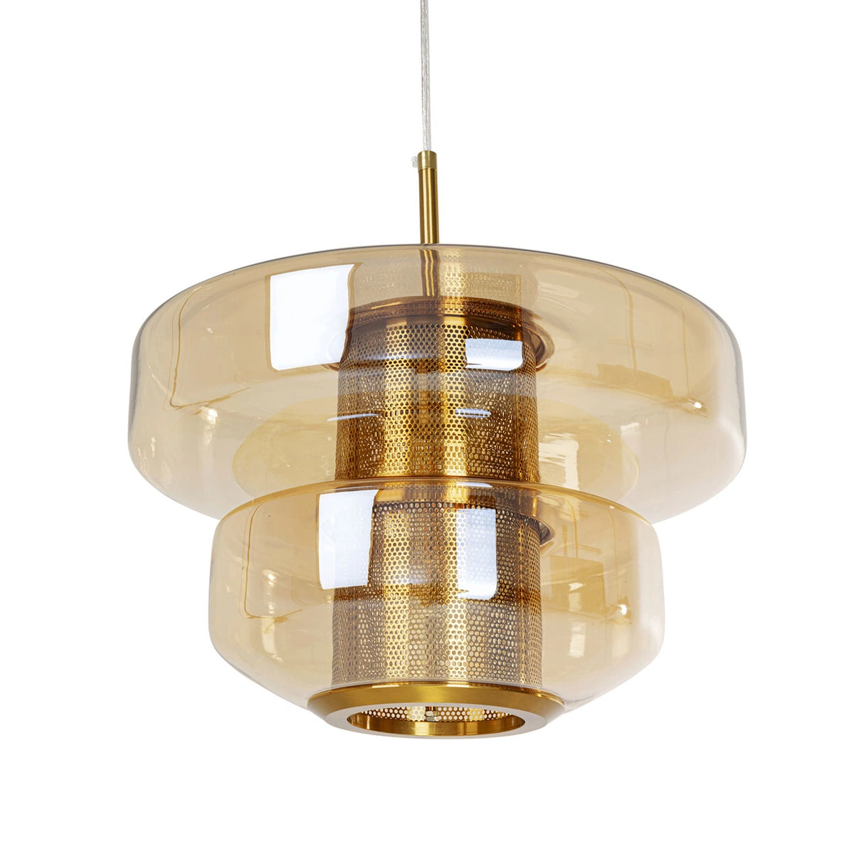 The Arcadia pendant lamp adds a warm decorative glow to dining areas and living spaces with its amber glass shade and elegant suspended design. Created for modern interiors, this ceiling light blends artistic form with practical illumination for stylish everyday environments. Featuring a titanium-coated steel canopy and an electroplated glass shade, the pendant offers durability with refined detailing. Its balanced proportions and hanging structure distribute soft ambient light evenly across dining tables and seating areas.