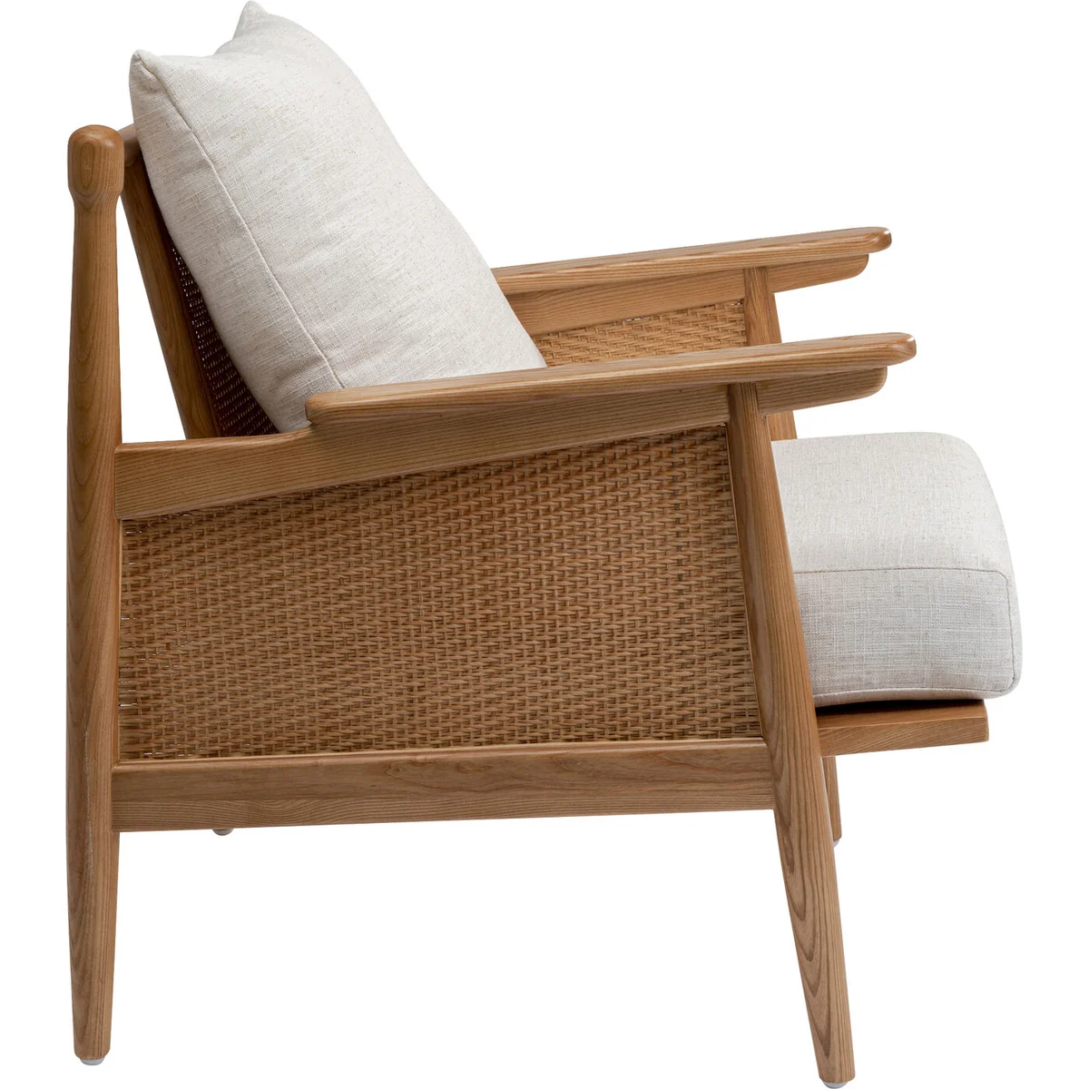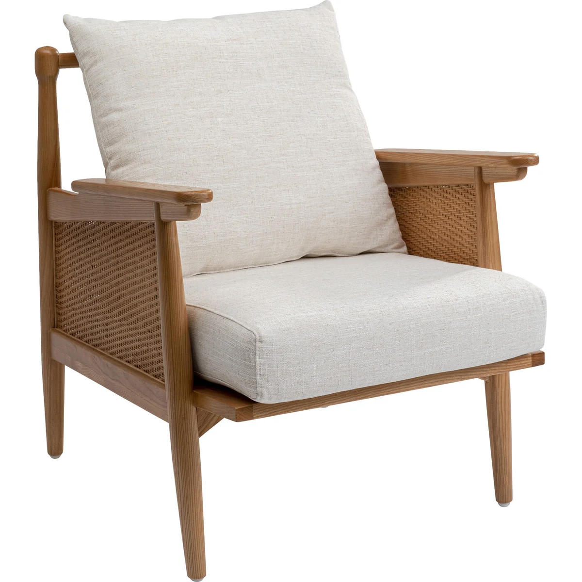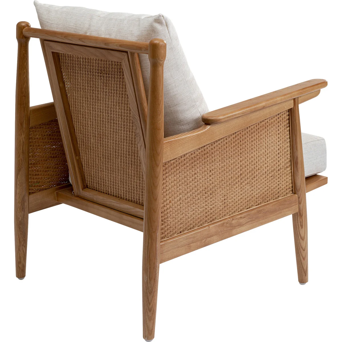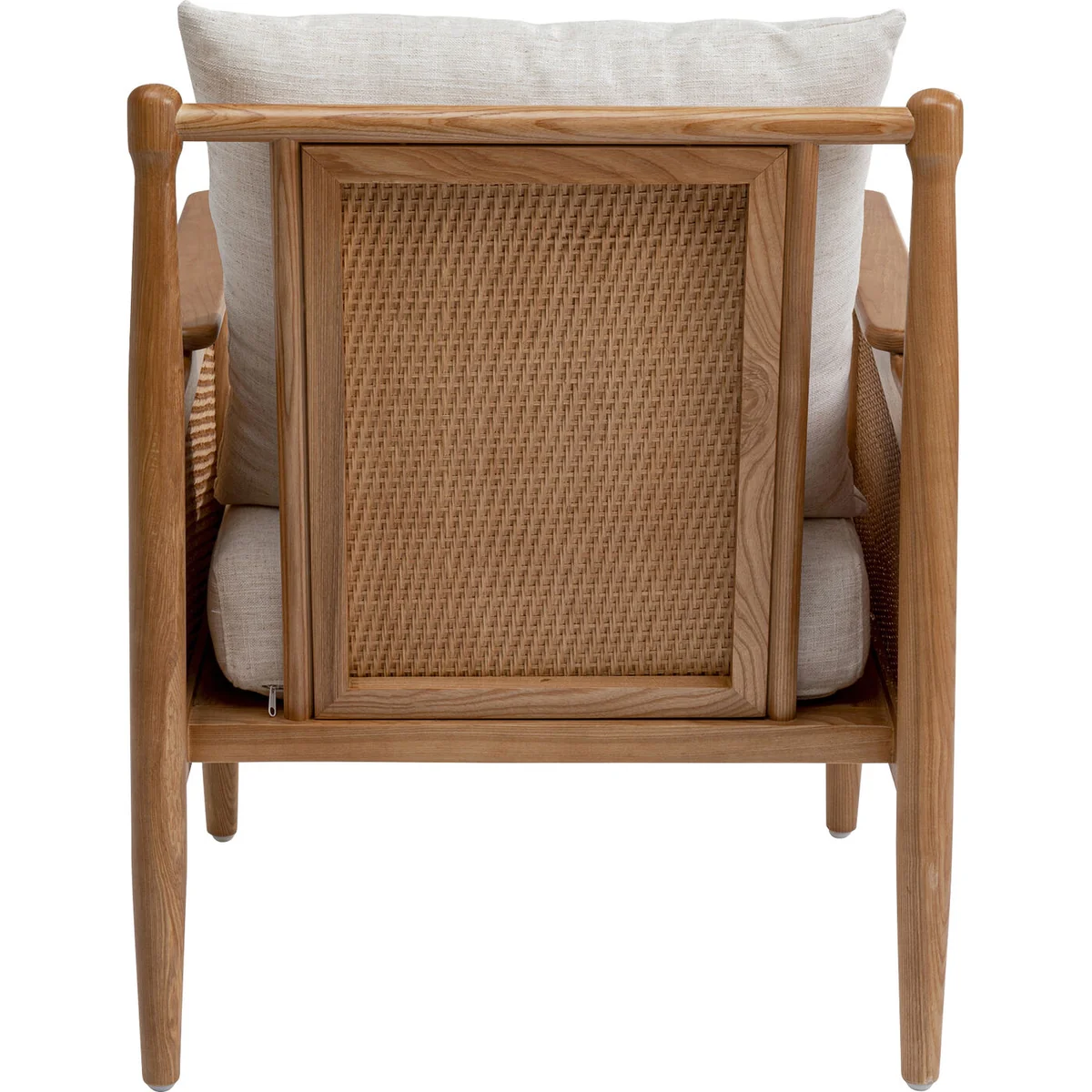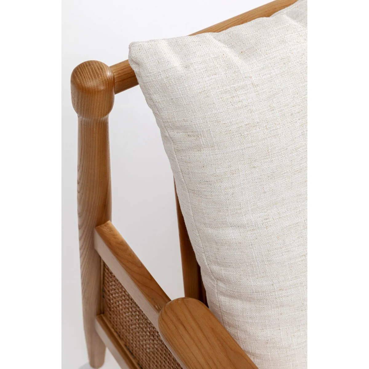 The armchair with armrests is made entirely of decorative, solid ash wood. This solid wood is not only beautiful, but also very hard. With this wooden armchair, you will therefore be acquiring a particularly durable living room armchair. The wicker back and armrests are a striking, aesthetic detail. The slightly mottled woven fabric contains a linen component and harmonises with the brown of the wood. With a designer piece of furniture like this one from KARE, you can easily create stylish seating areas in the living room, bedroom or study. One trick for a living room landscape with a distinctive character is to complement your corner couch or sofa with a comfortable armchair that stands out in terms of style.