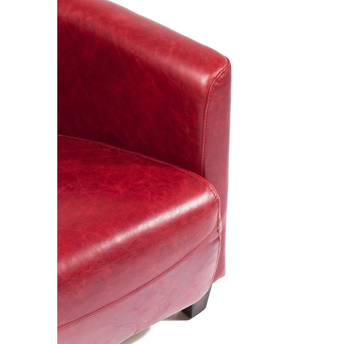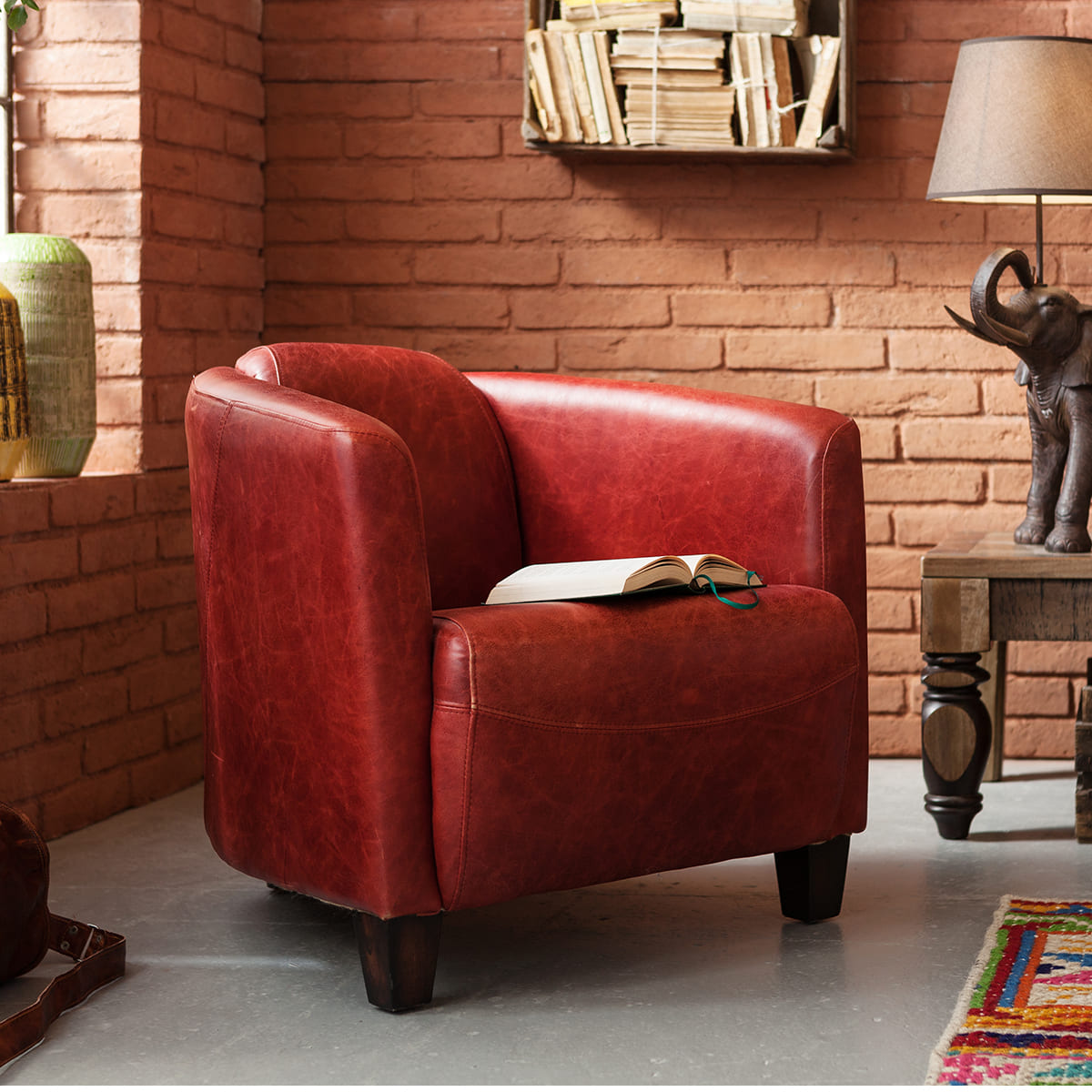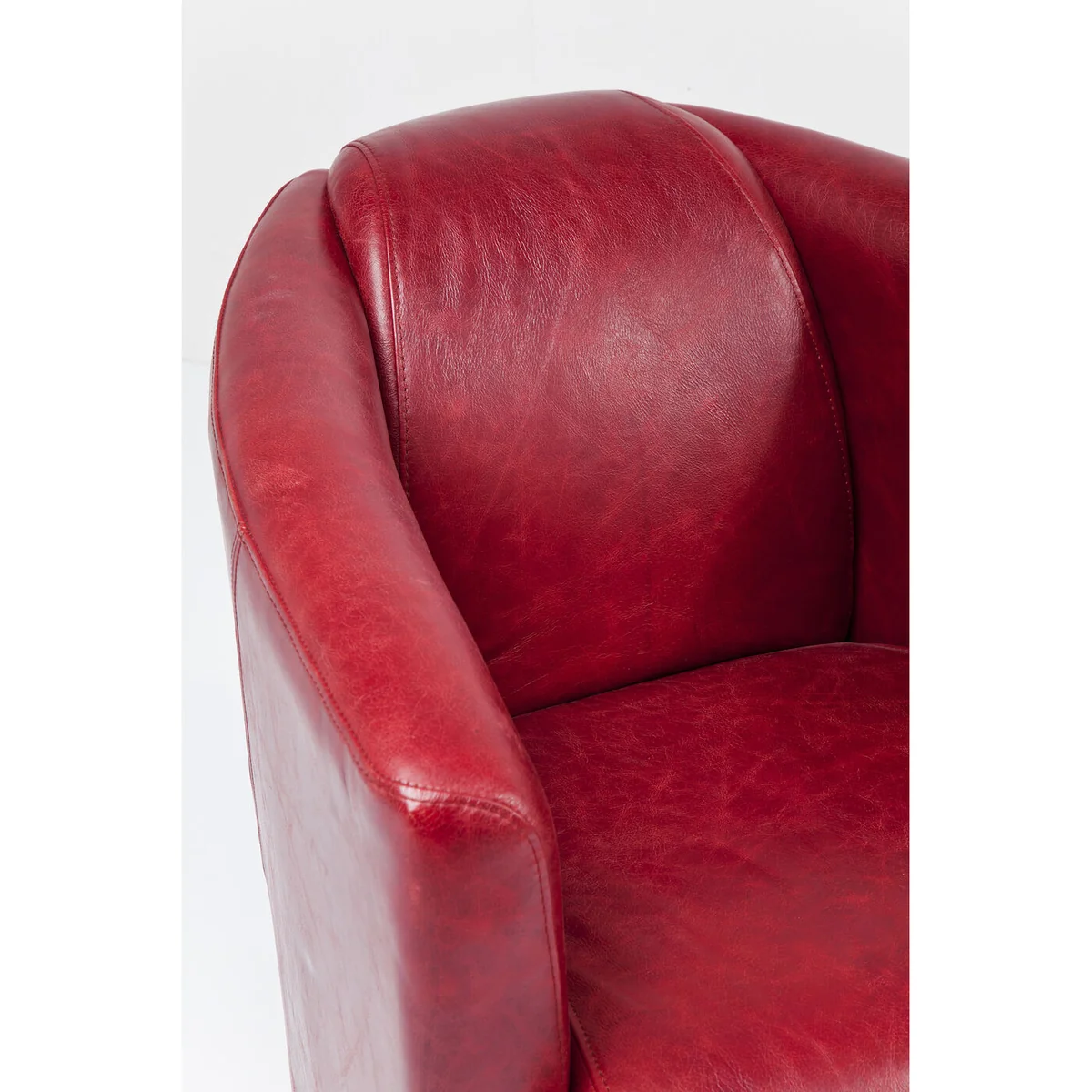 Clubby chic - This unconventionally designed armchair radiates personality and pure individualism. Aviation could have been the inspiration for its aerodynamic shape with the backrest and armrests flowing backwards. The result is an armchair with finely balanced proportions which makes a timeless and relaxed impression. Its upholstery made of red top-grain leather rounds off its top-quality impact. A piece of furniture for a lifelong friendship. This armchair is also available in brown and blue.