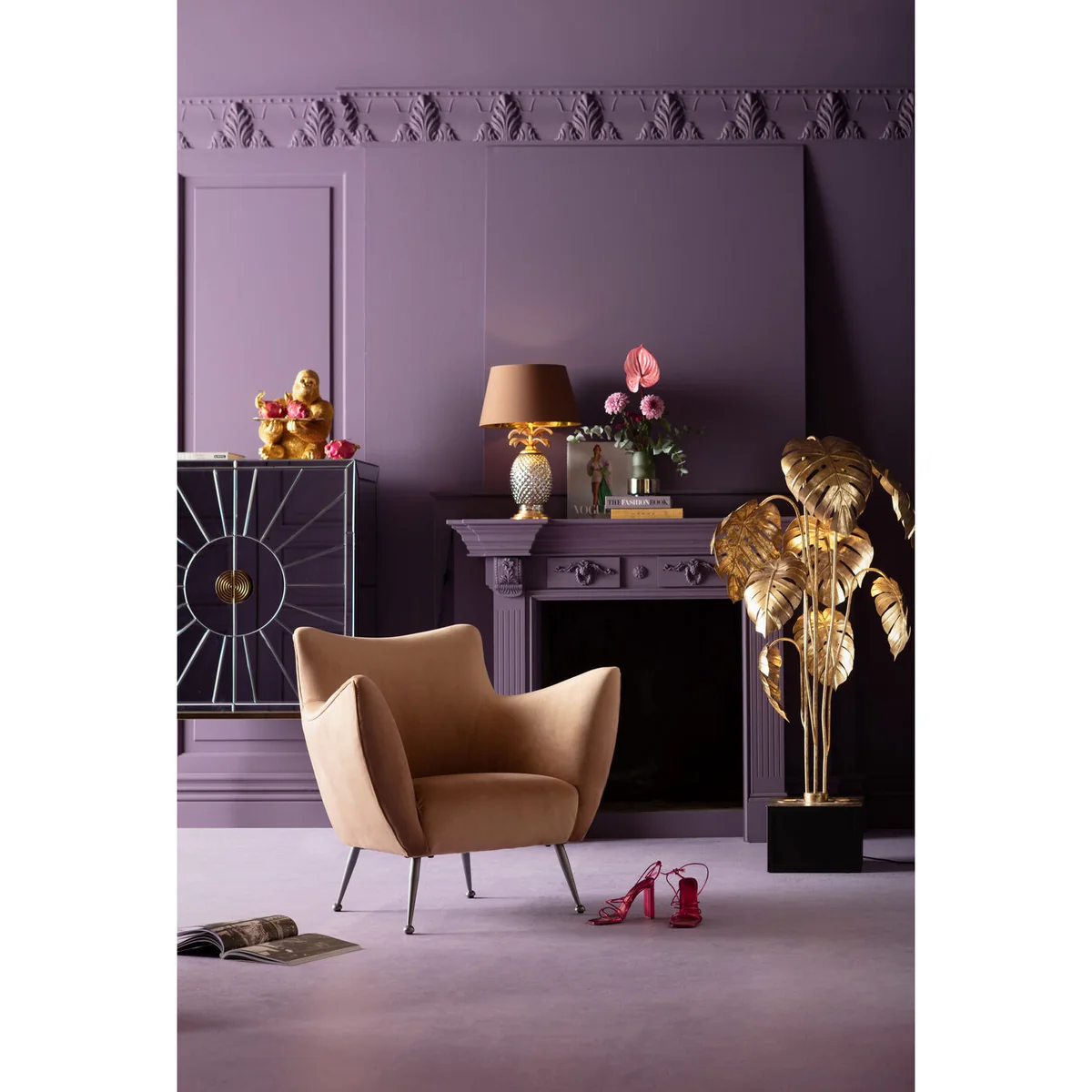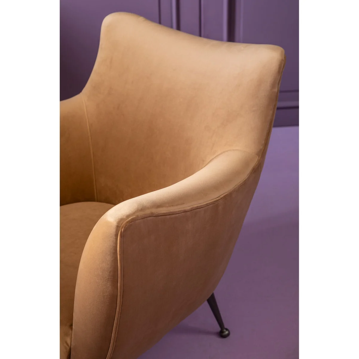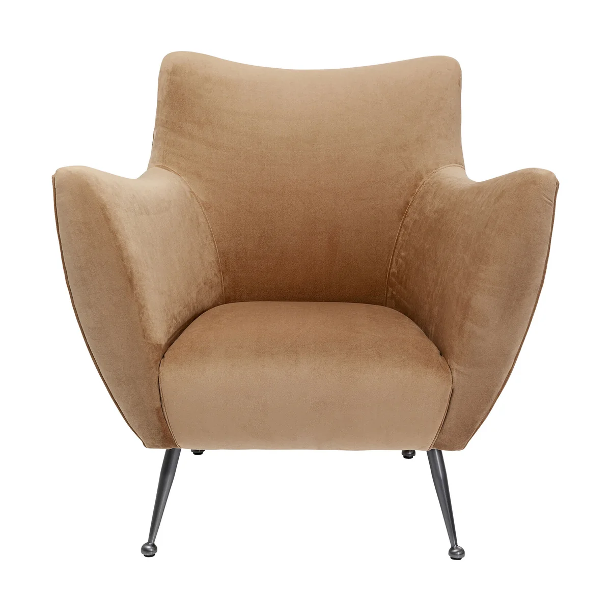 The Goldfinger Armchair in brown is upholstered in soft fabric, offering a stylish and comfortable seating option. The neutral brown hue adds a touch of elegance, making it a sophisticated addition to any space.