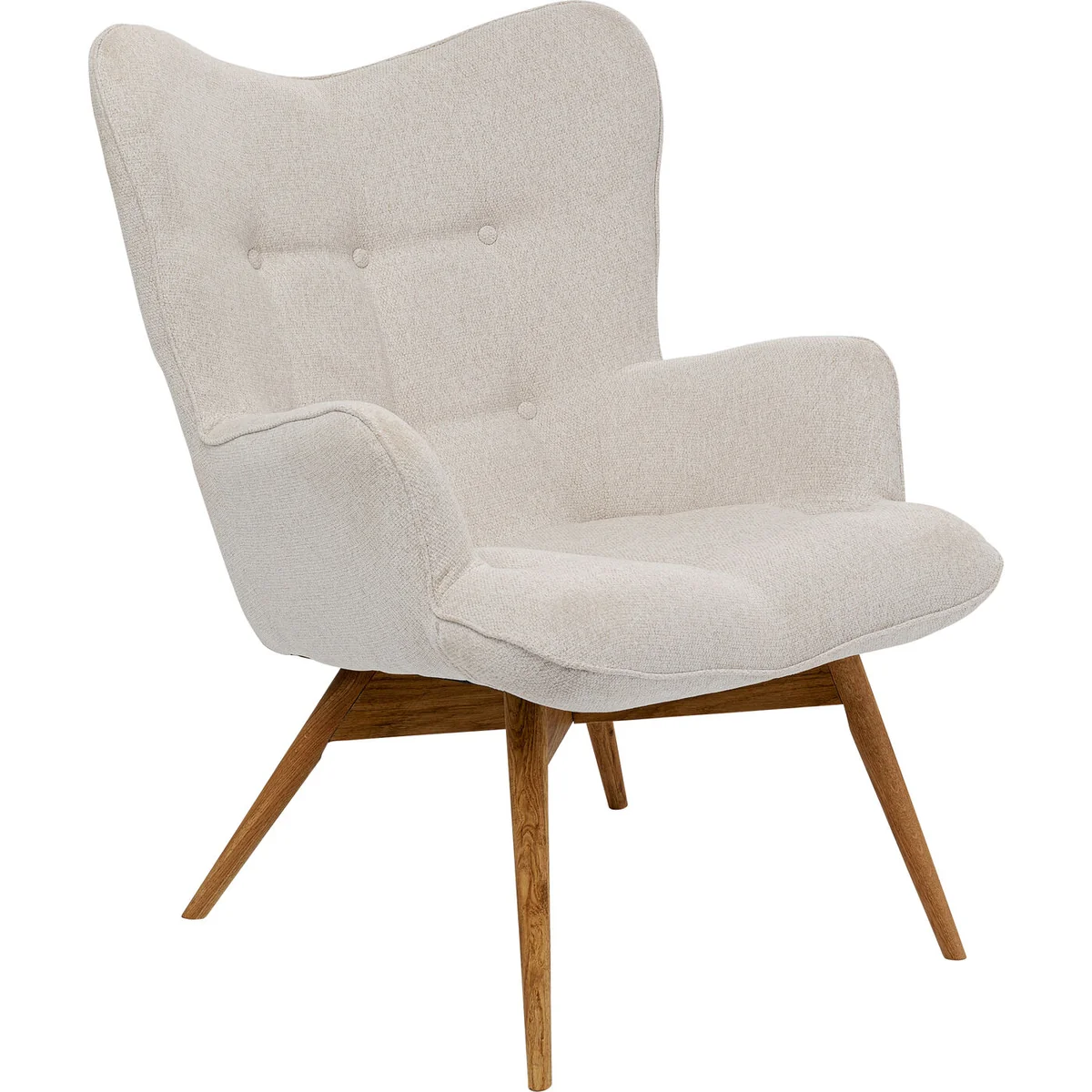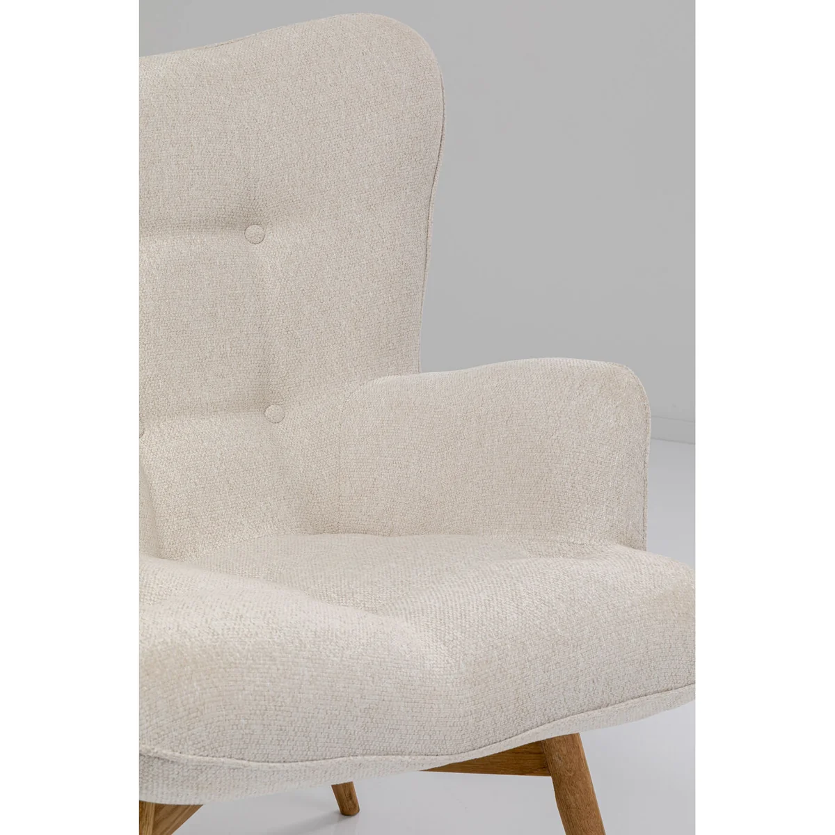 This lounge chair in beautiful cream really stands out! Thanks to its skilful design it looks much lighter and more modern than a traditional wingback chair. Enjoy the comfort of the spacious seat and the pleasantly rounded back of this armchair. The cornerstone of a high-quality and durable piece of upholstered furniture is the materials used. The legs are made of solid oak. We have placed particular emphasis on the quality of the upholstery fabric: it is certified in accordance with Standard 100 by ECO-TEX and its surface repels stains and dirt. A TV armchair, reading chair or designer armchair for your living room landscape - what role can this masterpiece play within your four walls?