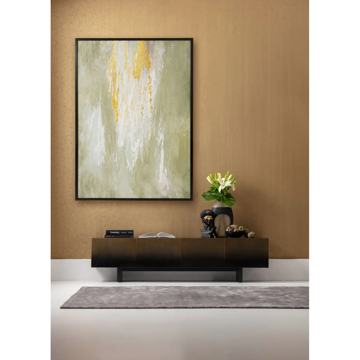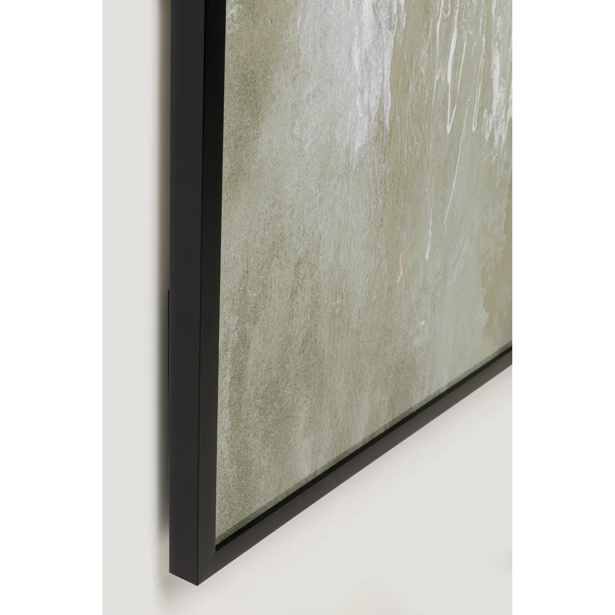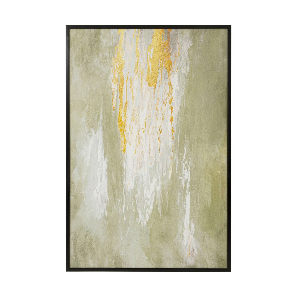 Key features of this piece include an abstract motif in soft green shades, accented by golden details. Its black polystyrene frame provides a neat finish, while its pre-mounted picture hooks allow for easy horizontal or vertical wall mounting. This artwork measures 180 cm in height, 120 cm in width, with a depth of 3.7 cm.
