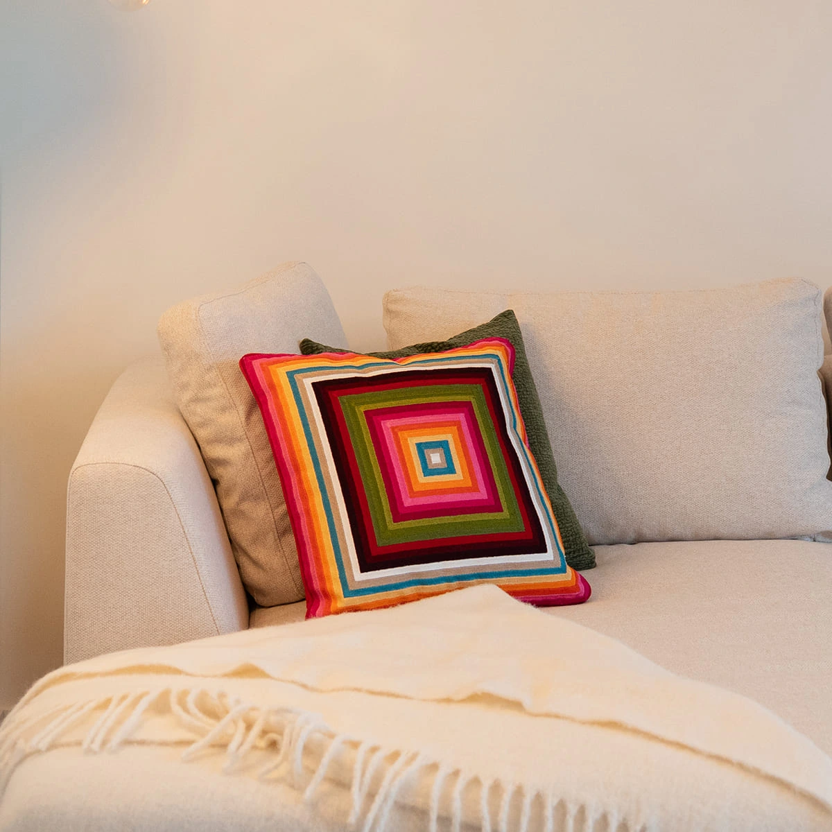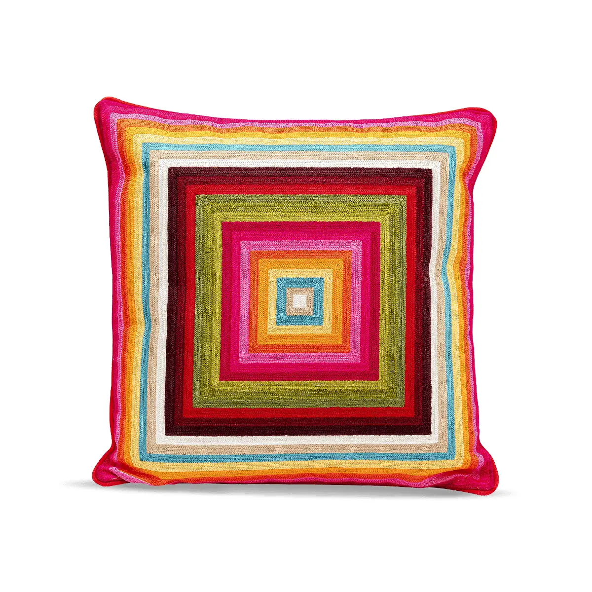 Introducing the Artistic Square Cushion in multicolored wool and cotton blend, a vibrant addition to your home decor. With its lively shades and linear design, it's a perfect blend of style and comfort.