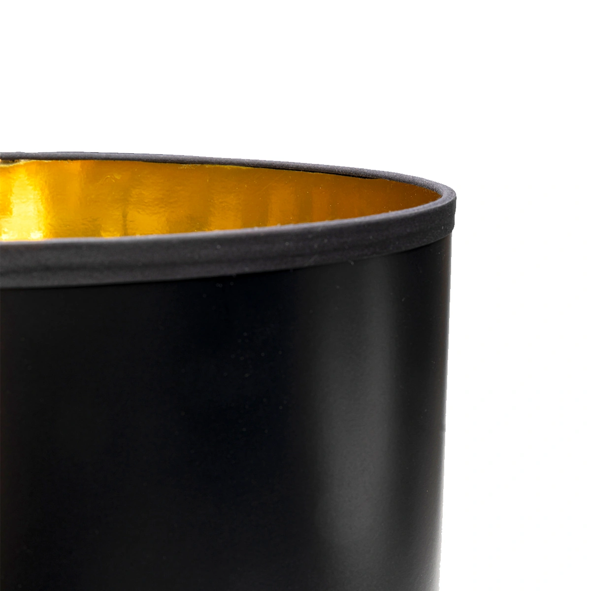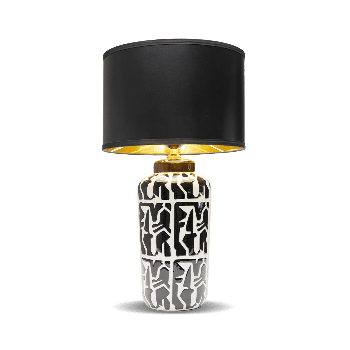 Impressively designed with a sculptural base, this table lamp stands at 62 cm. With dimensions of 36 cm by 36 cm, it features a black and white artistic pattern. The lampshade, made of 100% polyester, has a shiny gold interior that casts a warm, tender glow.