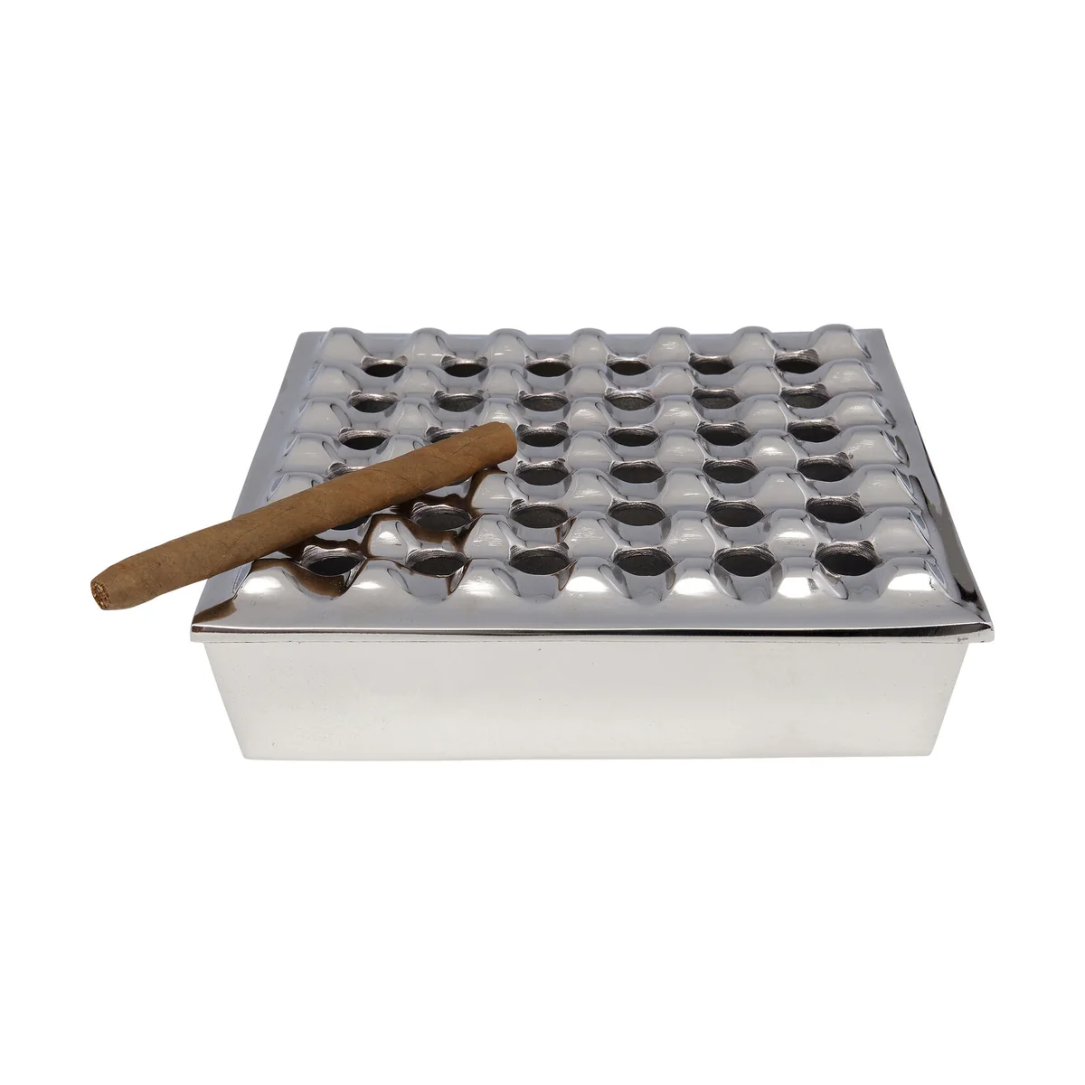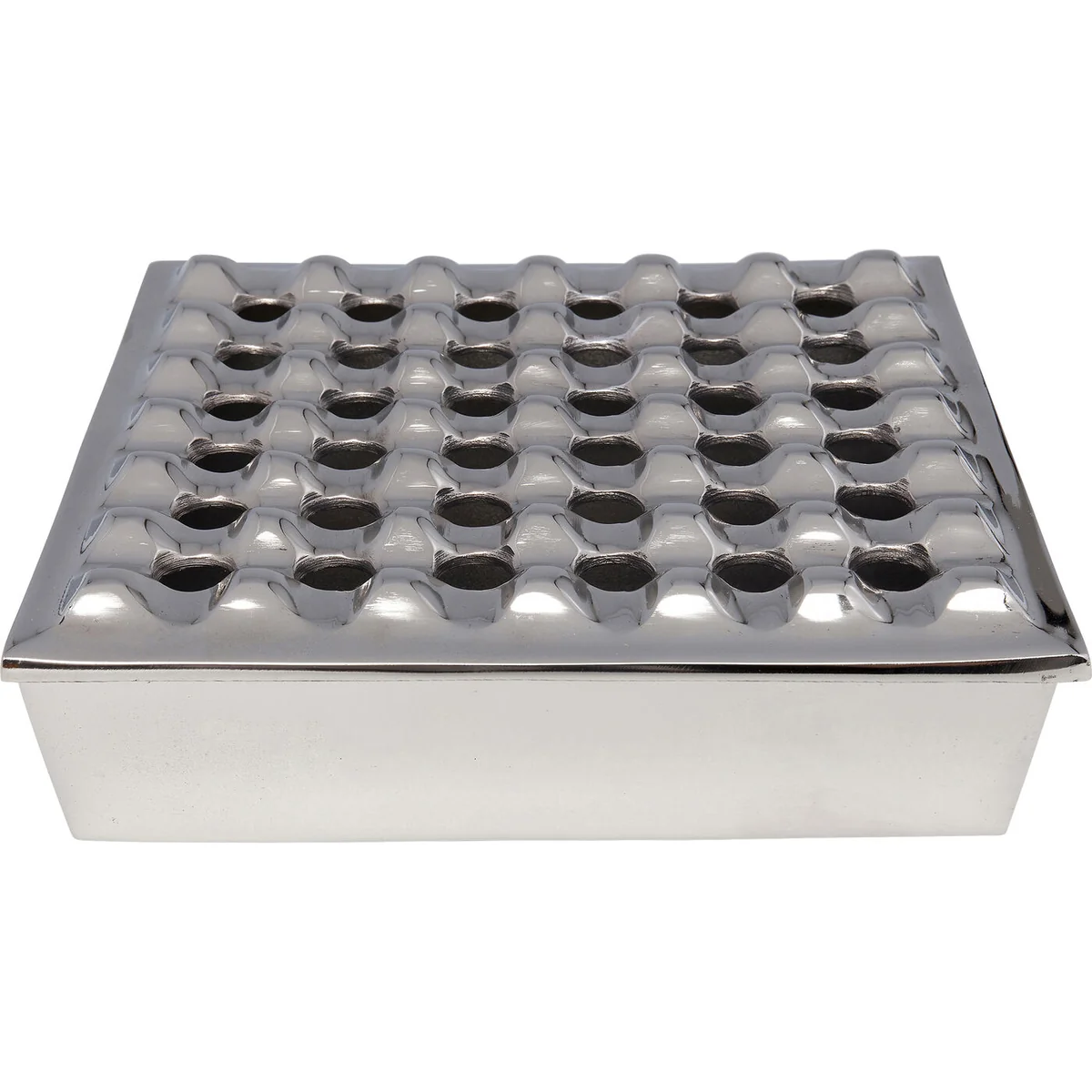 The ashtray measures 25cm in length and width, and 7cm in height. It's made from durable aluminum with a sophisticated silver chrome finish. The square shape adds a modern twist to the traditional ashtray, making it a perfect fit for contemporary spaces.