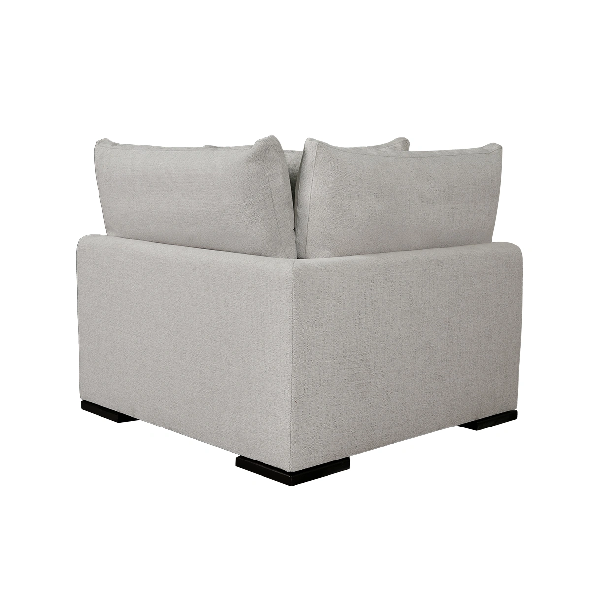 This sofa arm is designed with a sturdy frame made from pine wood, plywood, and chipboard, ensuring durability. It’s upholstered in Amaral fabric, a woven textile that adds a soft touch to its square silhouette. The seat cushions are filled with high-resilience polyurethane foam, while the back cushions are densely packed with goose feathers for ultimate comfort. The solid beech wood legs with a dark tone finish, add to its overall appeal.