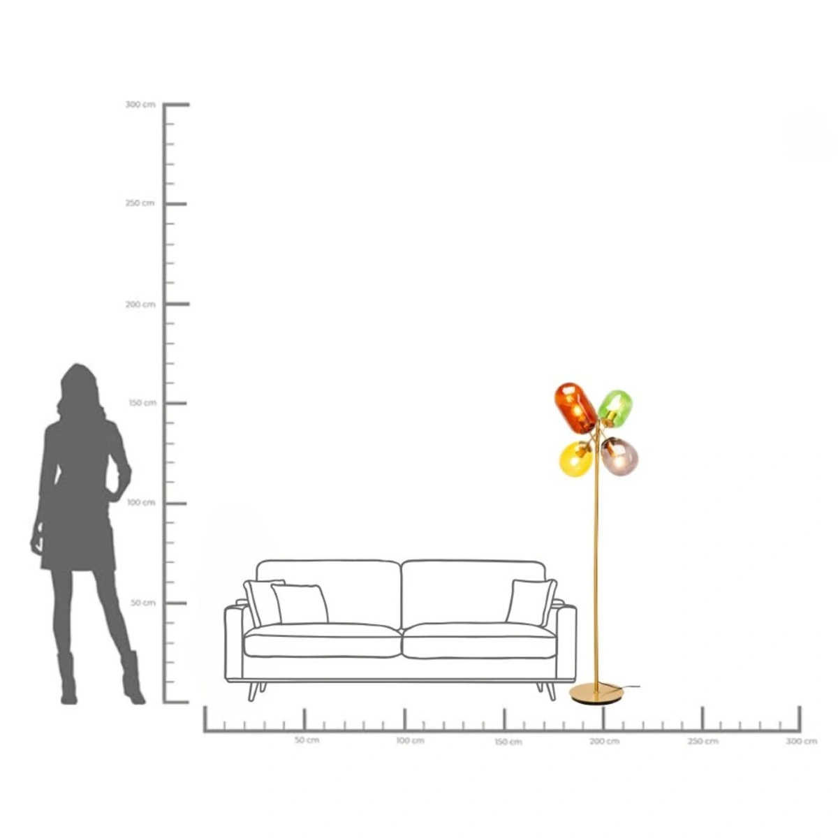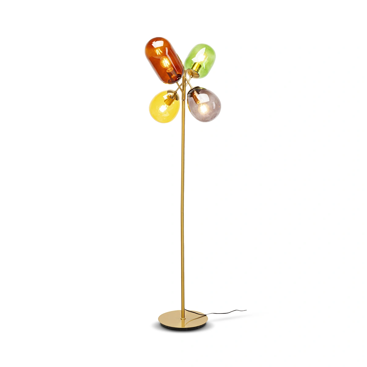 A real work of lighting art with the wow factor - this floor lamp plays with color, shape and fantasy. The four glass shades look like floating balloons, shimmering in soft tones from honey yellow to smoky gray and lending the room a dreamlike atmosphere. The sophisticated combination of galvanized glass and brass-coloured frame brings elegance into play and takes the design to a new level. Whether as a stylish statement in the living room or as an eye-catcher in the bedroom - this light sets targeted accents and brings modern art into the interior. Particularly effective in clean settings or as a highlight in a retro mix.