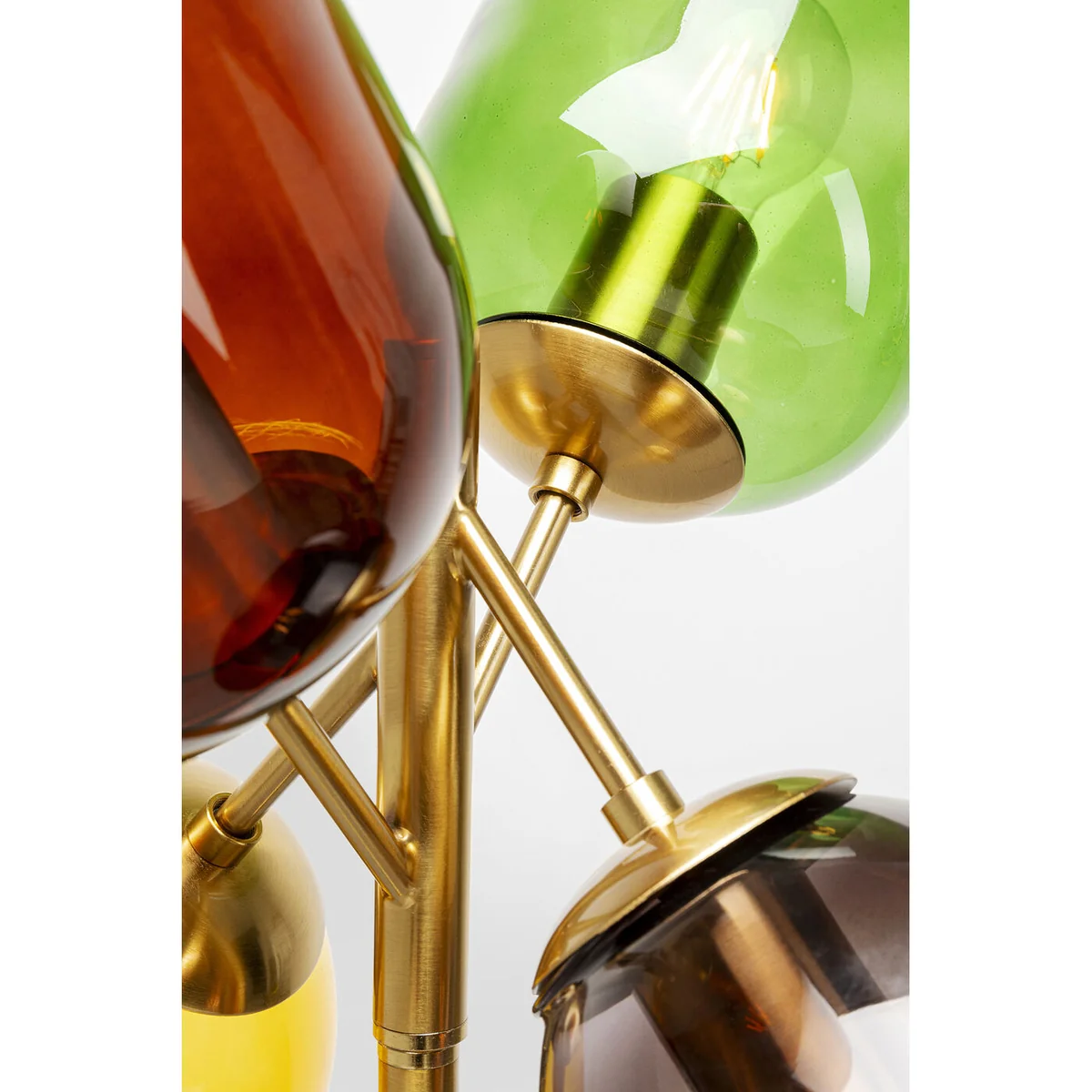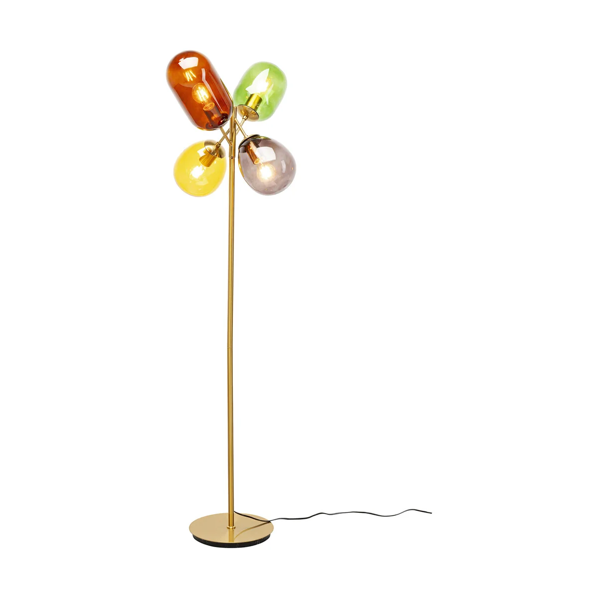 Its four glass shades, reminiscent of floating balloons, shimmer in soft, natural tones from honey yellow to smoky gray. The lamp stands elegantly at 162 x 48 x 48 cm, with a brass-coated steel finish that speaks of high quality. This lamp offers 230 V, a socket E27, and requires 4 bulbs (max. 40 watts, not included).