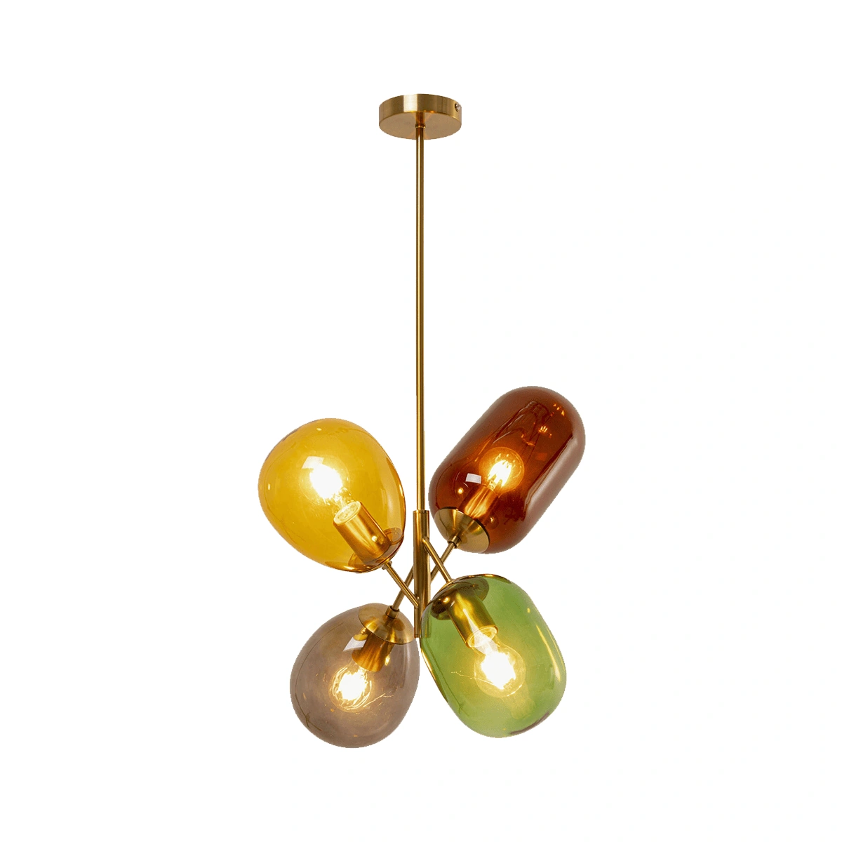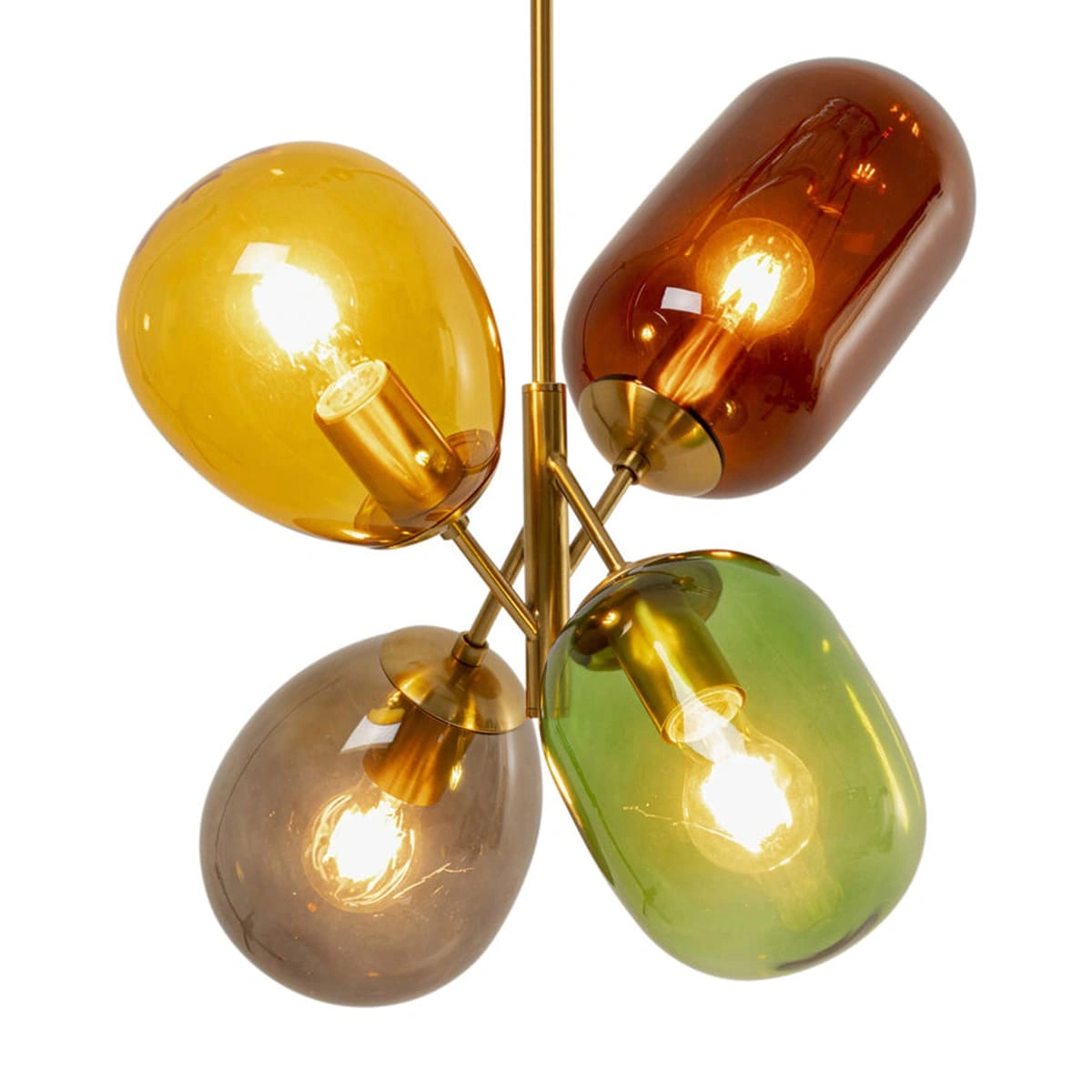 The semi-transparent glass shades of this pendant lamp dance through the room like floating splashes of color - inspired by shimmering balloons that radiate lightness and fantasy. In soft tones such as smoky gray, honey yellow, moss green and warm brown, the design provides atmospheric light with artistic flair. The elegant brass-look finish gives the luminaire a high-quality touch and makes it a stylish focal point above the dining table, in high hallways or as a creative lighting installation in the living area. Particularly effective in clean interiors or in an exciting mix with mid-century furniture and statement pieces. A design that not only shines - but inspires.