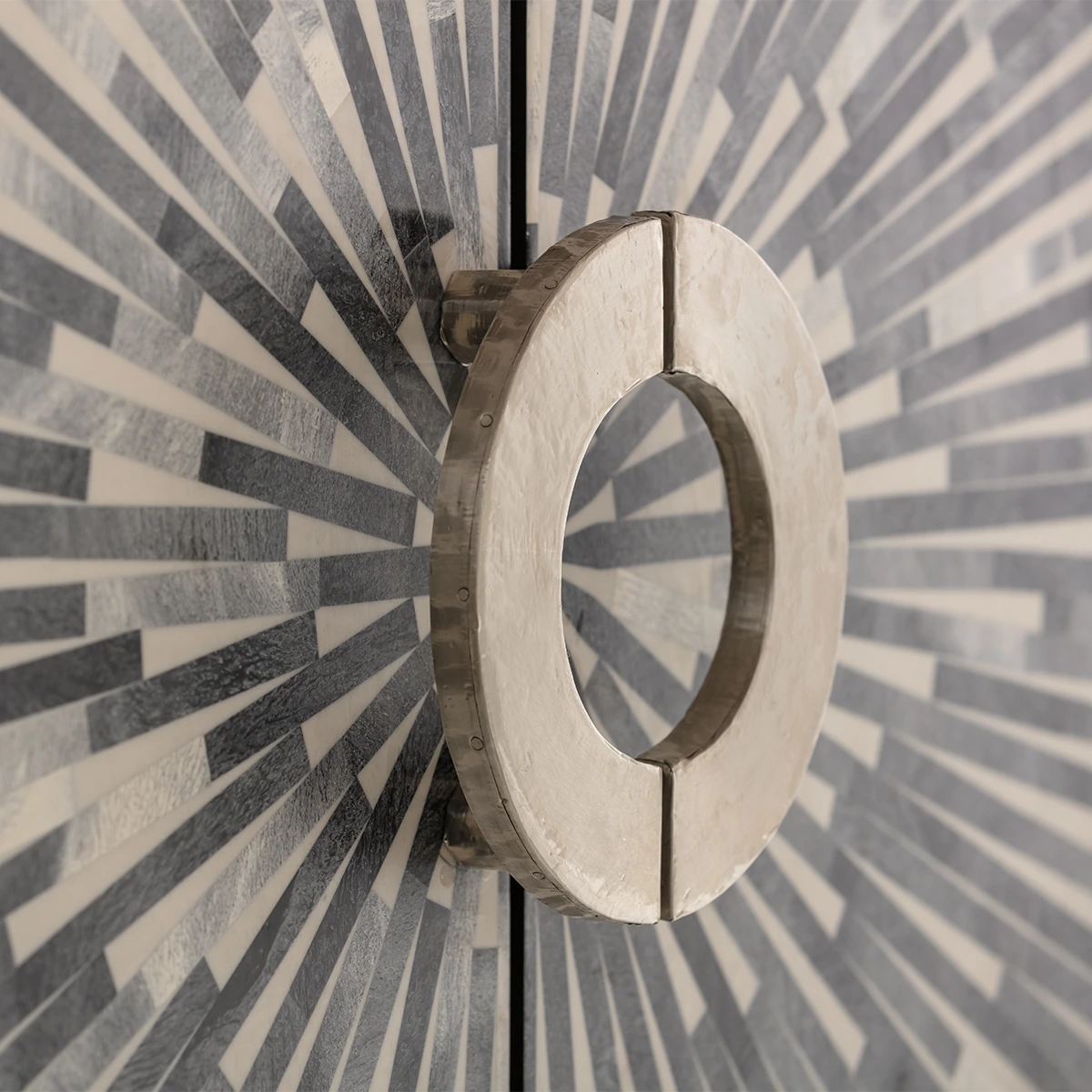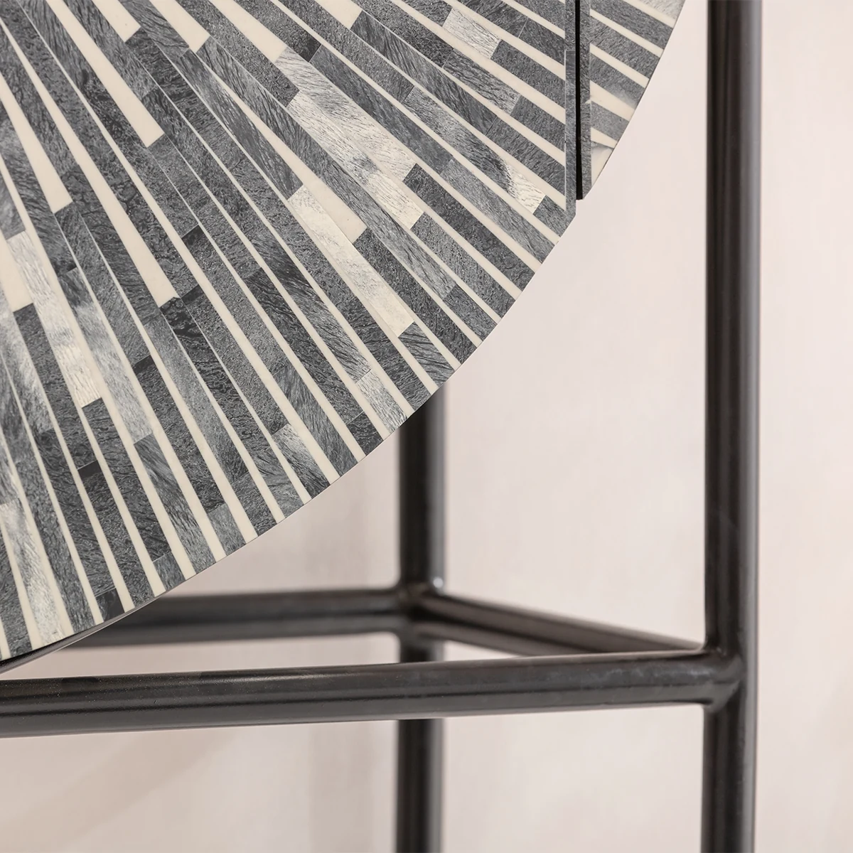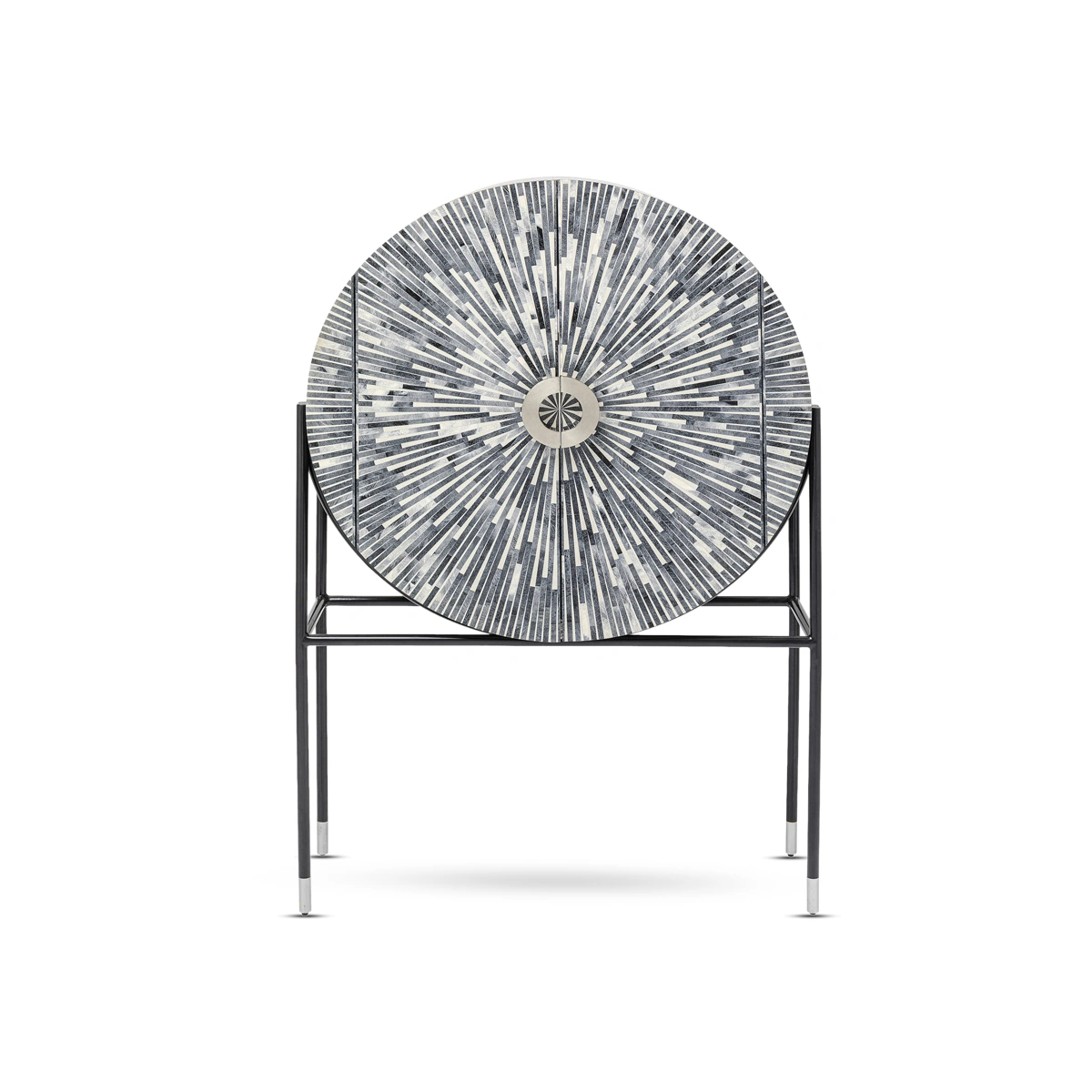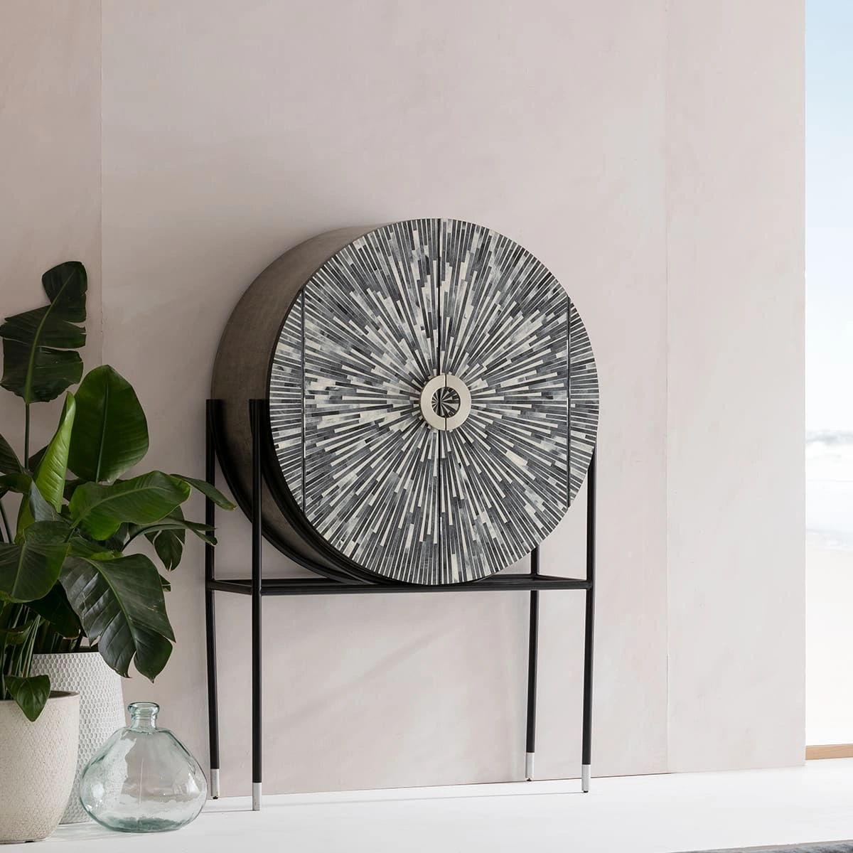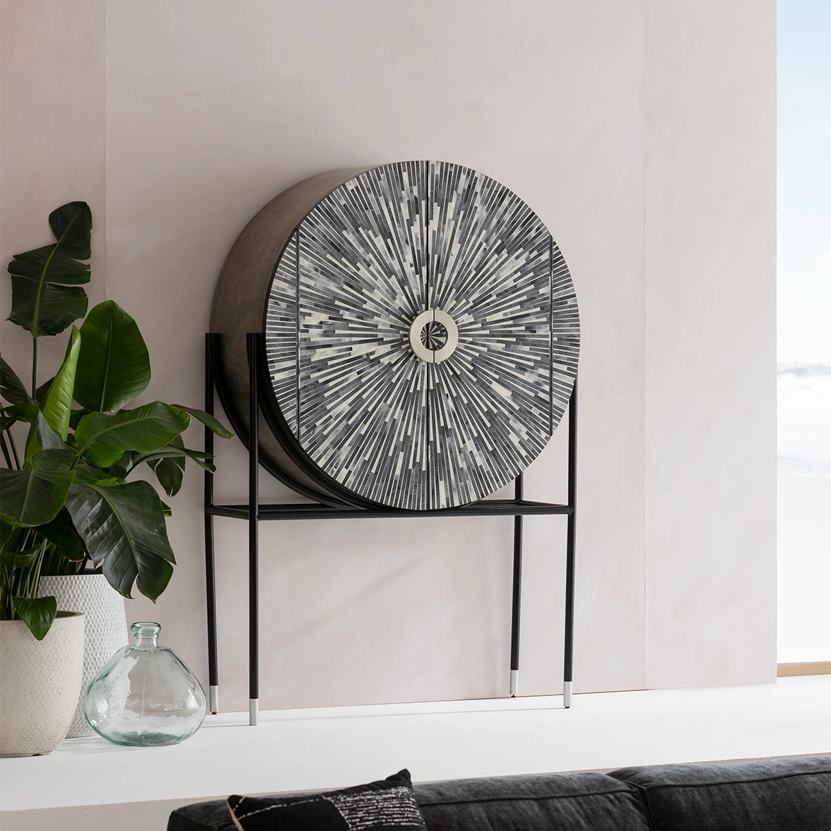 When you let your fingers glide over the smooth front with the inlay-like work and discover the hammered surfaces of the round frame, you will be able to imagine how much time and detailed knowledge went into this handcrafted piece of furniture. Since each one of these living room cabinets is unique, no two are alike. But the radiant pattern in different shades of grey is always fascinating. The frame of the cabinet, which is made of powder-coated steel, keeps a low profile in order to let the rounded shape play the leading role. Designed as a home bar in which you can also store a few bottles lying down, Zoom will also make an impact as a design object in other parts of the house. How would this cabinet look in the bedroom as a store for fine linen or a perfume collection, for example? What would your guests think when you present and use Zoom as a decorative hall cupboard? With its high-quality materials, a handcrafted article of designer furniture like this one is sure to find a place anywhere as a piece with character that will never lose its value.