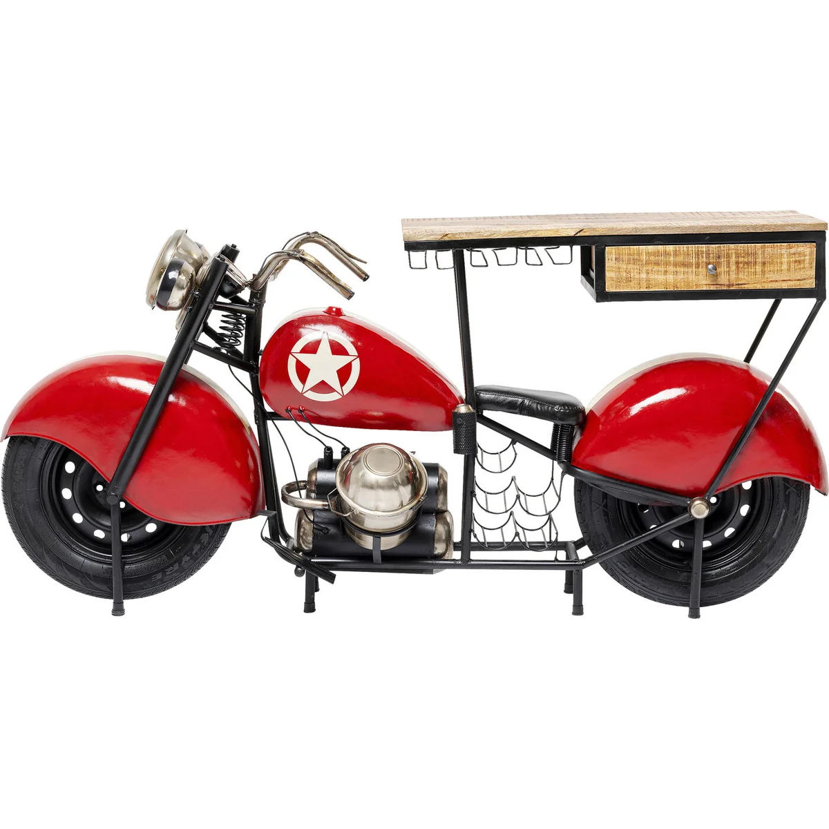 • Home bar in red with all the trimmings - a typical KARE piece of designer furniture, sized 98x210x42cm (H/W/D) • With this bar in the shape of a motorbike you won't be short of admiring guests • Made of steel and solid wood with real tyres made of a rubber compound • Lots of functions: holders for stemware, a drawer for bar utensils and a bottle cooler on the engine • 5 bottle holders between the engine and rear tyre