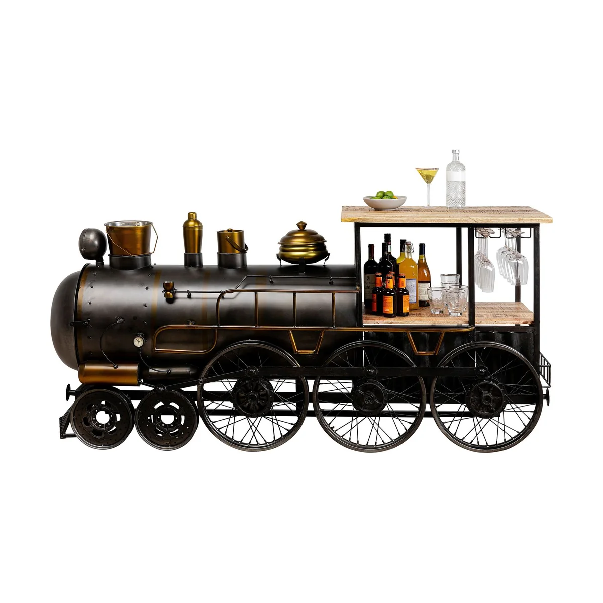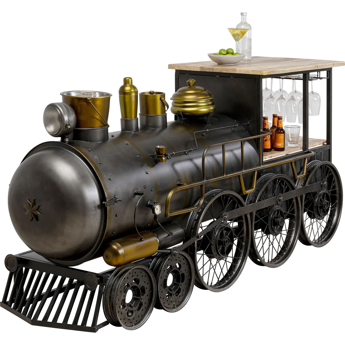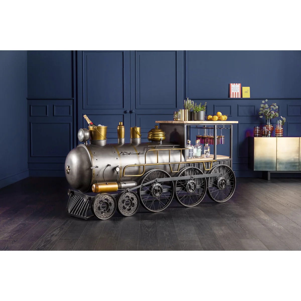 The Steamlock home bar is a historic steam engine that serves as a stylish bar. Each bar is handcrafted from mango wood and steel to ensure a unique look. Many details are painted gold to emphasise the authentic styling of the steam engine. The steam locomotive look is enhanced by a black lacquer finish. With a bottle cooler, ice bucket, cocktail shaker and glass holders, you have everything needed for a party!