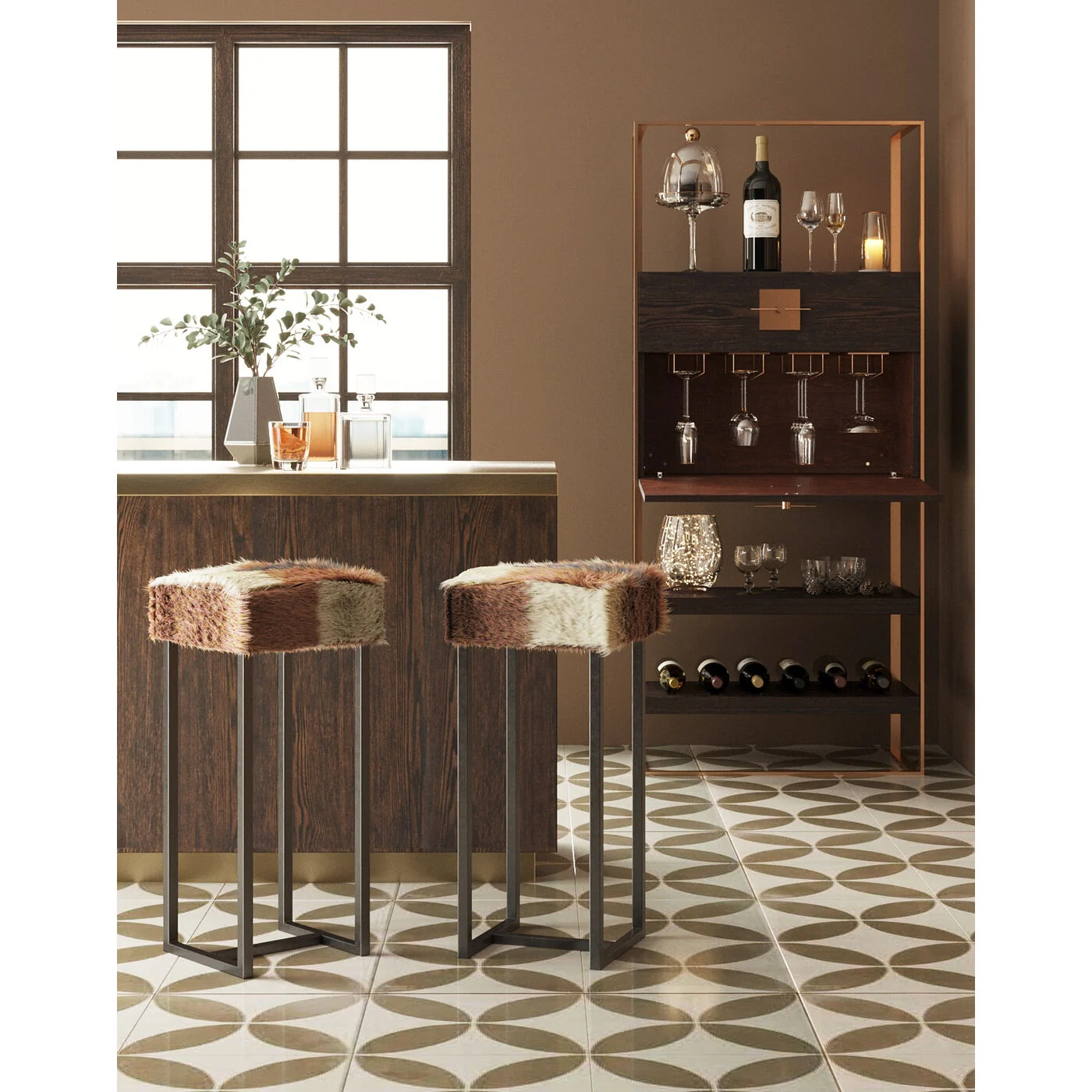With dimensions of L 35 cm | D 35 cm | H 74 cm, the stool is compact and versatile, fitting seamlessly into any home bar or kitchen counter. The rack is made from lacquered steel, ensuring a strong and sturdy construction that promises longevity. Its brown color adds a warm touch to the space.