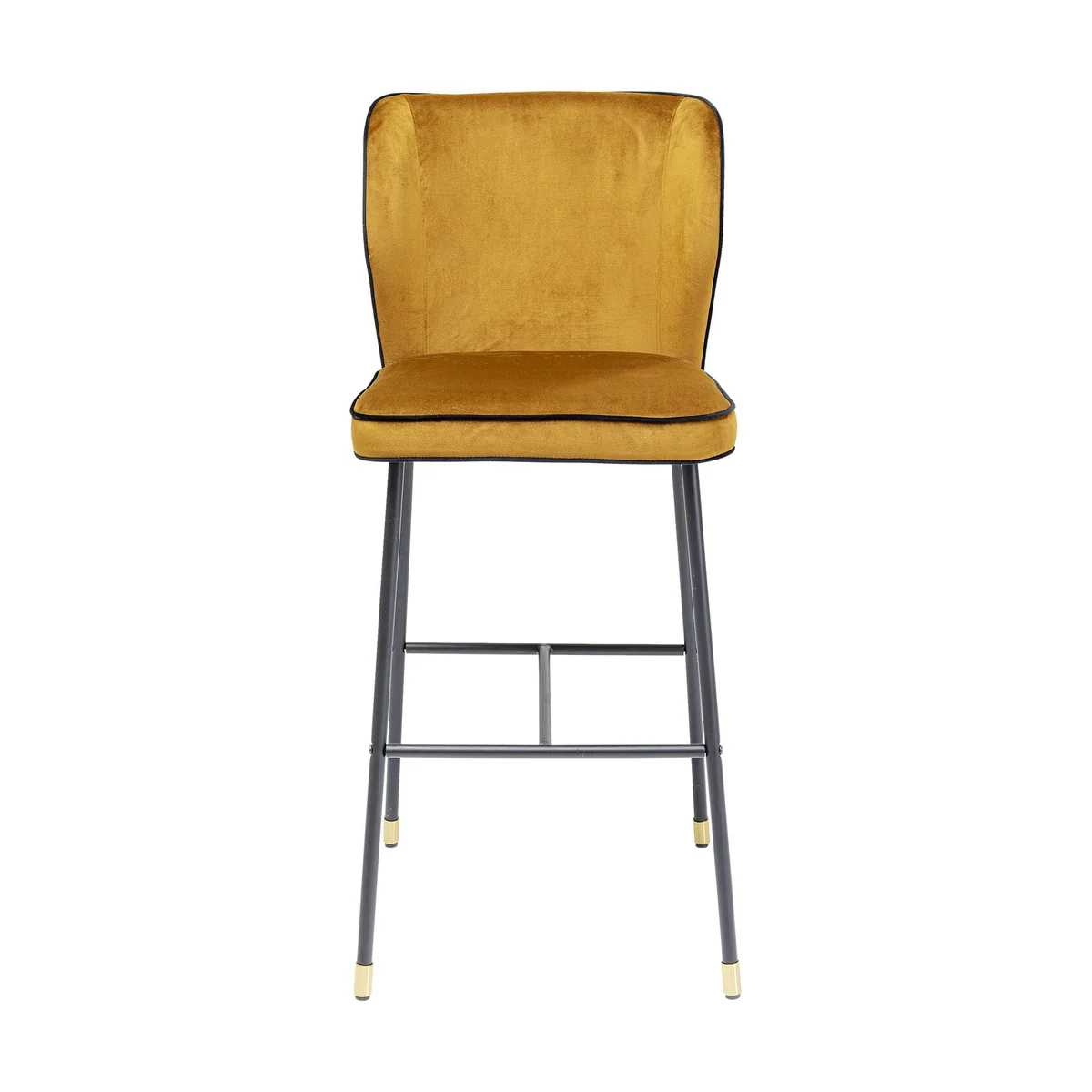 • Upholstered barstool with a velvety cover in golden yellow and a black frame with brass-coloured sleeves on the feet • Exclusive retro chic in fashionable colours for the high dining table, the home bar and the kitchen counter • The comfortably rounded backrest, full-length upholstery and comfortable footrests make this stool so comfortable • The black lacquered frame made of solid steel ensures reliable stability • A wide range of bar counters and home bars to suit every taste is available from our shop