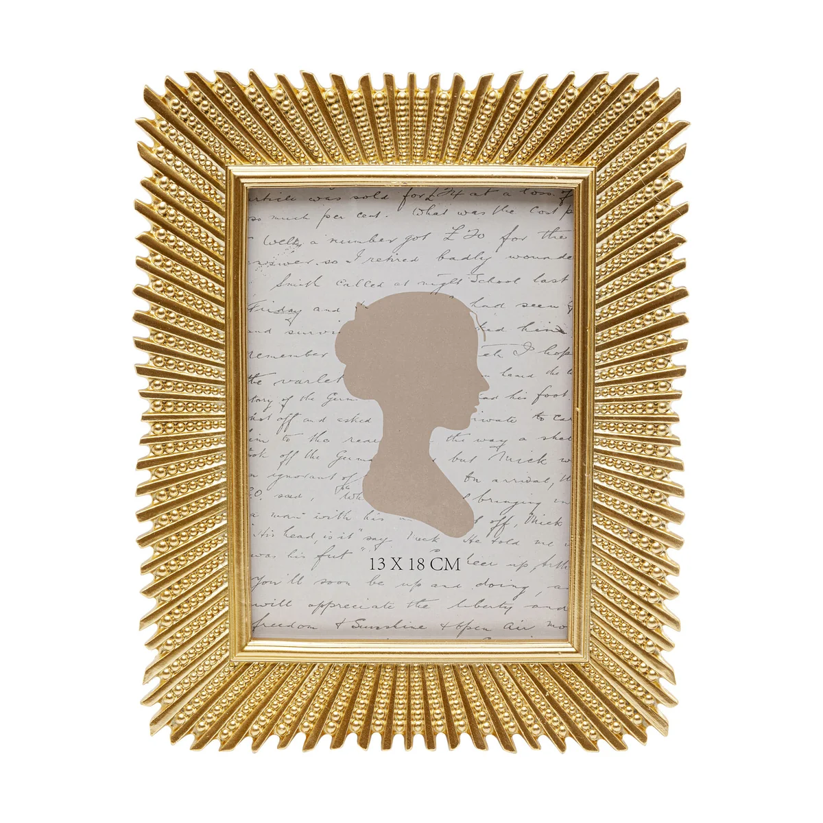 Key features of this frame include its detailed structure, and the shiny gold finish which makes it a luxurious eye-catcher. Sized at 20x25 cm, it is made of dimensionally stable polyresin, carefully handcrafted with great attention to detail. The frame's back panel is made of paperboard, giving it a sturdy build.