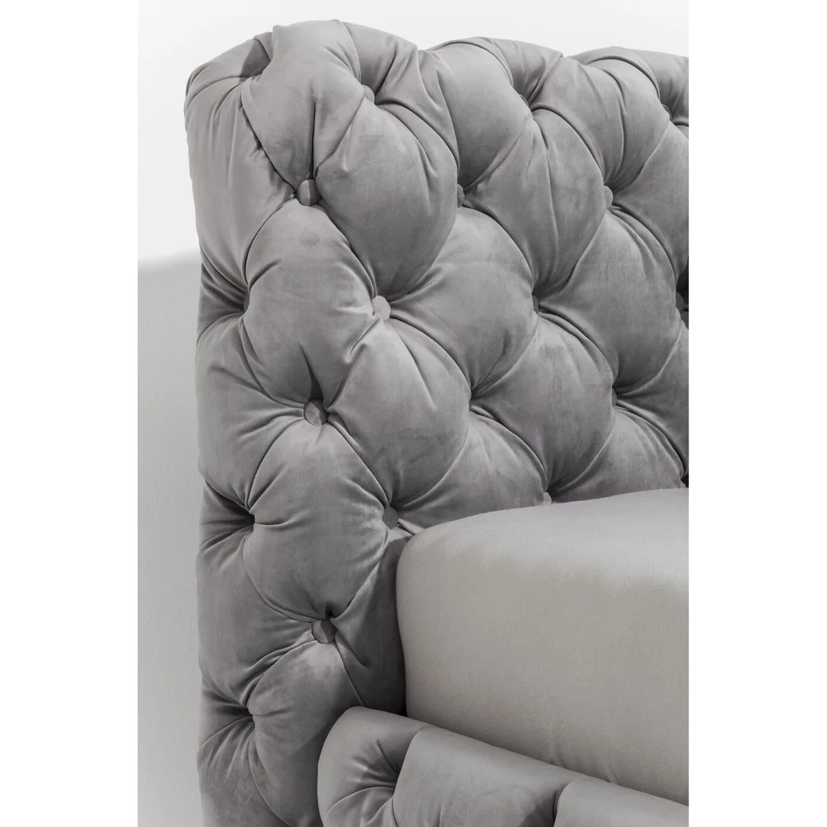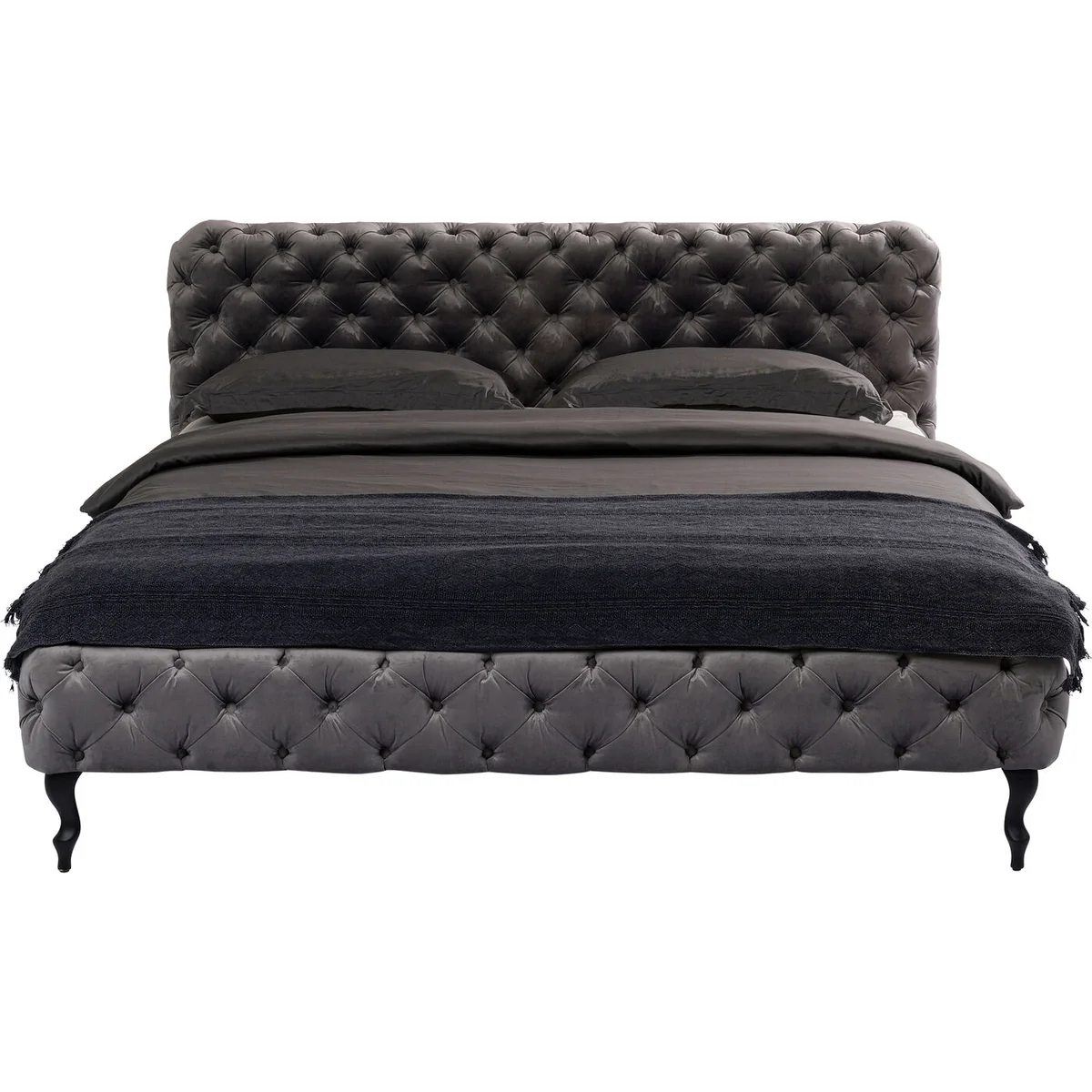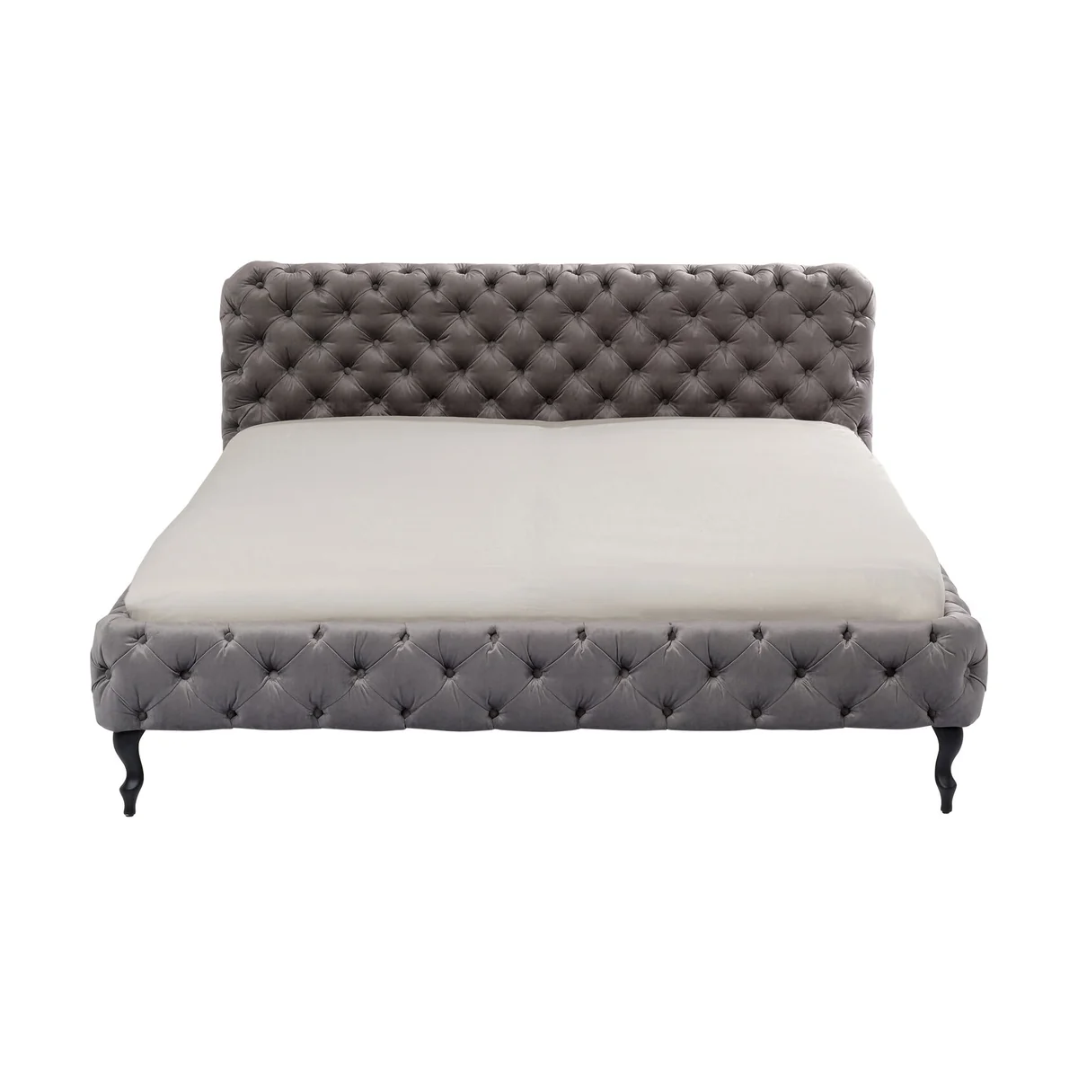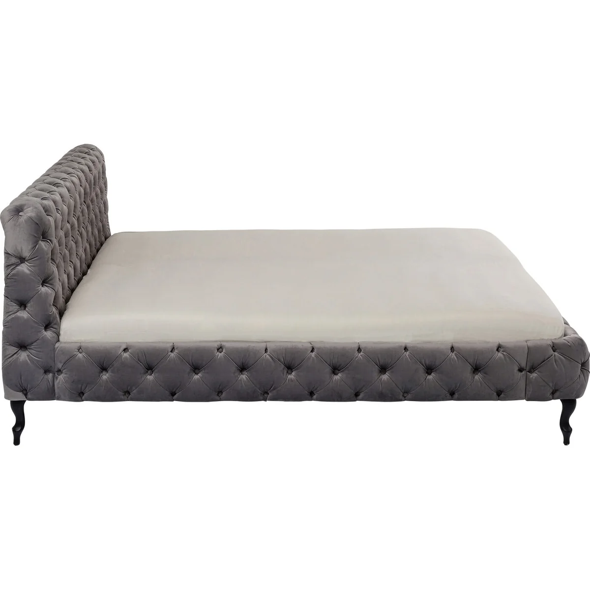 • This silver-grey upholstered bed with a velvety cover, also in silver-grey, elaborate button stitching and neo-baroque feet in solid beech is really luxurious • For pleasant dreams: a comfortably upholstered headboard and the generous dimensions of the 160 x 200 cm reclining area • Royal is the new normal: an upgrade in the bedroom, because the bed is made for much more than sleeping! • A refined velvet look: the grey fabric cover shimmers light and dark, depending on how the light falls on it • The slatted frame and mattress for the bed are available separately in the shop