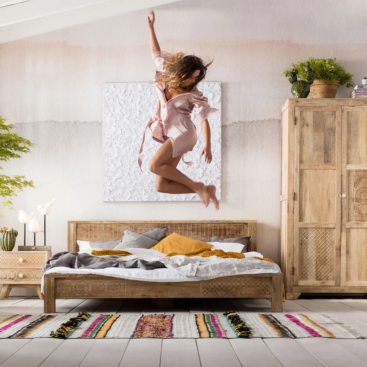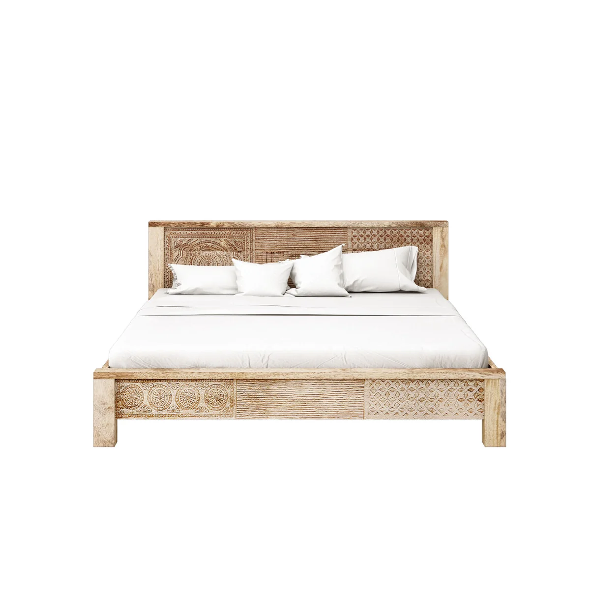 Key features of this bed include a robust frame made from lacquered mango solid wood, providing durability and long-lasting quality. It's designed to accommodate a 160x200 cm mattress, making it an ideal choice for those seeking a spacious and comfortable sleeping area.