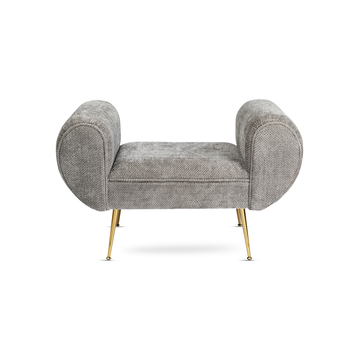 Trono is an original upholstered bench that stands out thanks to its special design with retro elements. The steel legs are coated with brass and look really elegant. The upholstered armrests offer additional seating comfort and give the Trono bench its special charm. Whether in the living room as a cosy seat, as a shoe bench in the hallway or in the bedroom as a comfortable bench by the bed, the Trono bench is a real all-rounder. Thanks to its eye-catching design, it can be easily integrated into any modern furnishing concept and will be an eye-catcher wherever you place it. With the Trono bench an original piece of designer furniture will be moving into your home, and you will be delighted not only by its appearance but also with the great seating comfort it offers.