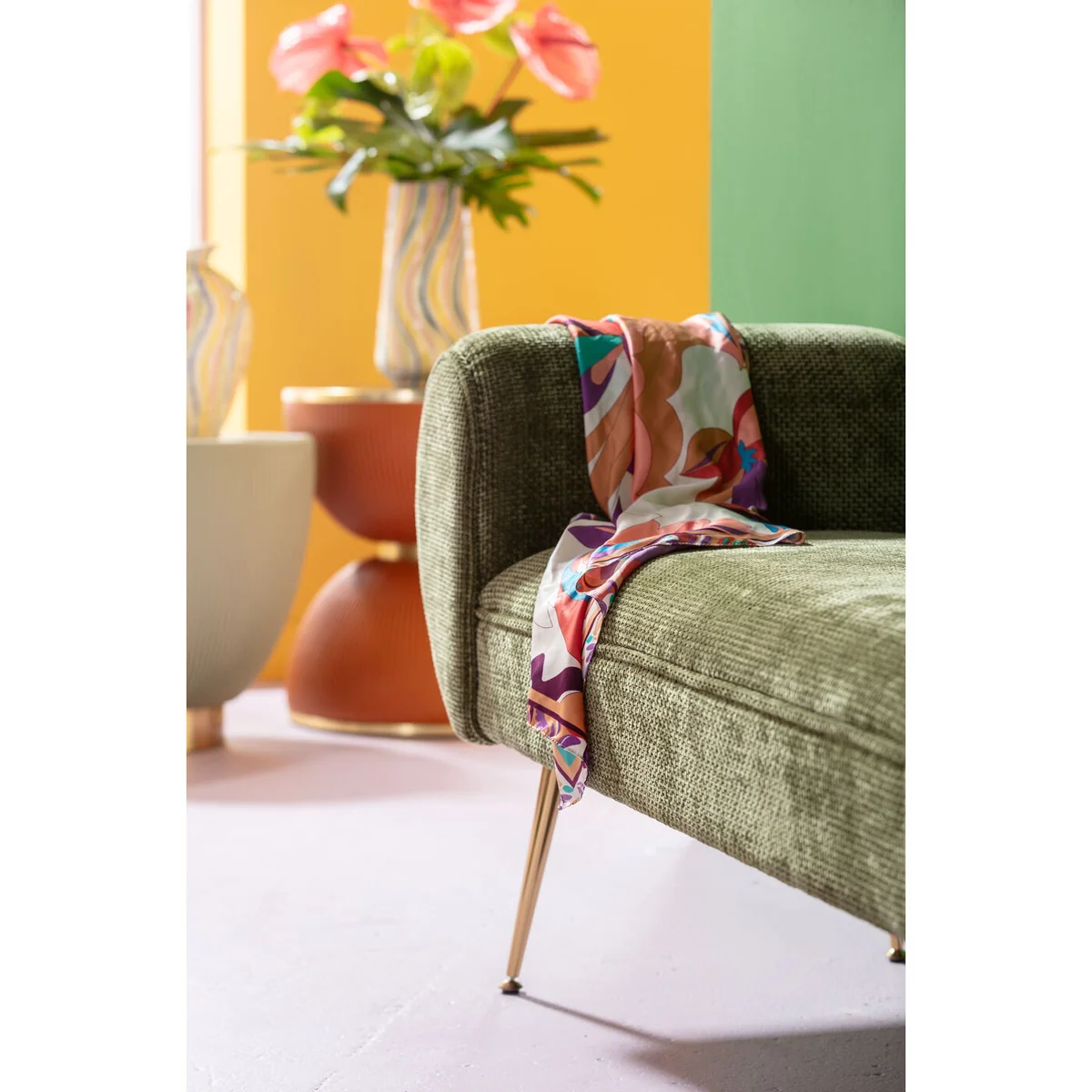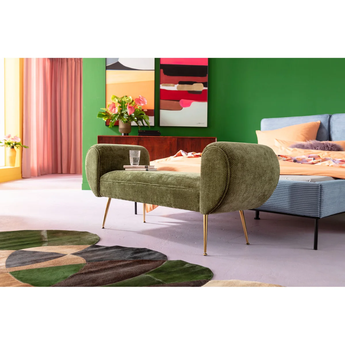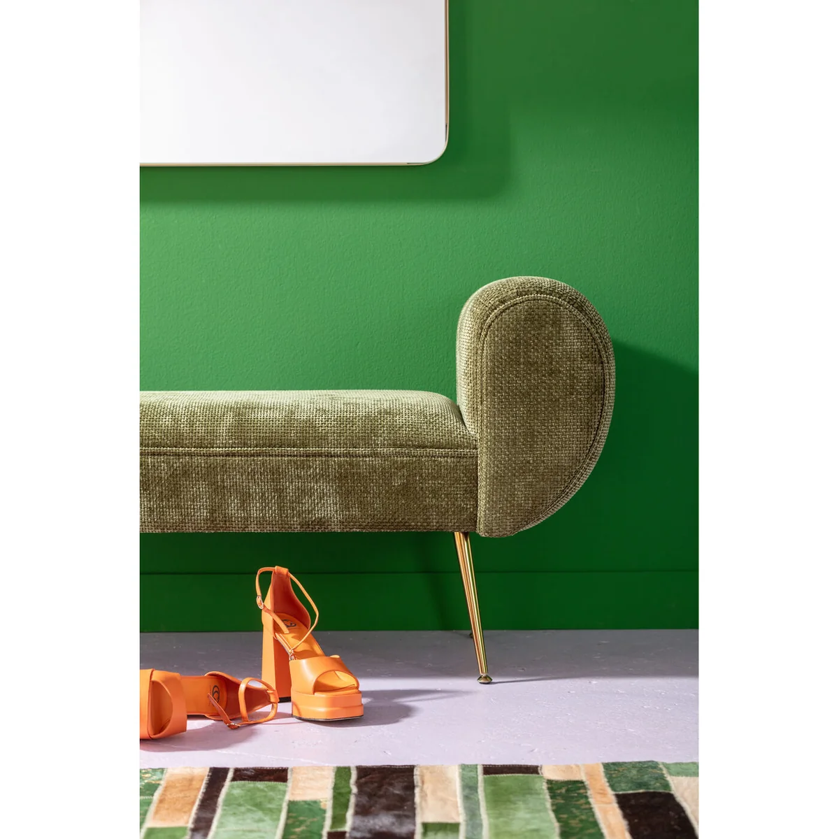 Introducing the Trono Bench in vibrant green, a delightful addition to your living space. With its golden plywood frame, this bench brings together modern design and high-quality materials.