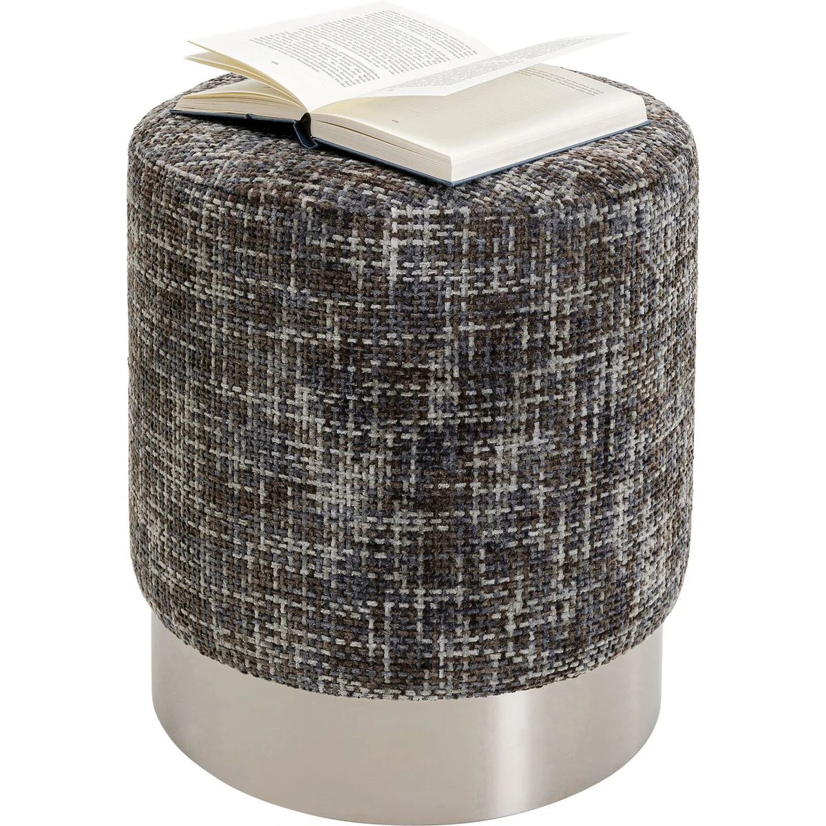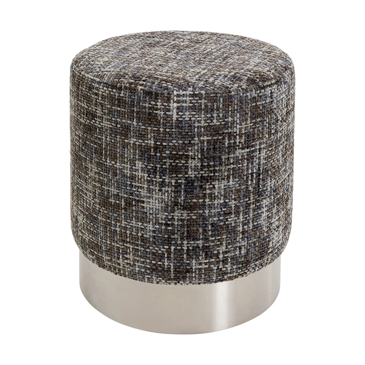 Introducing the Berry High Stool in dark grey polyester and silver stainless steel, a versatile addition to any living space. This piece combines mottled fabric textures with cool metallic accents to offer a perfect blend of coziness and modern design.