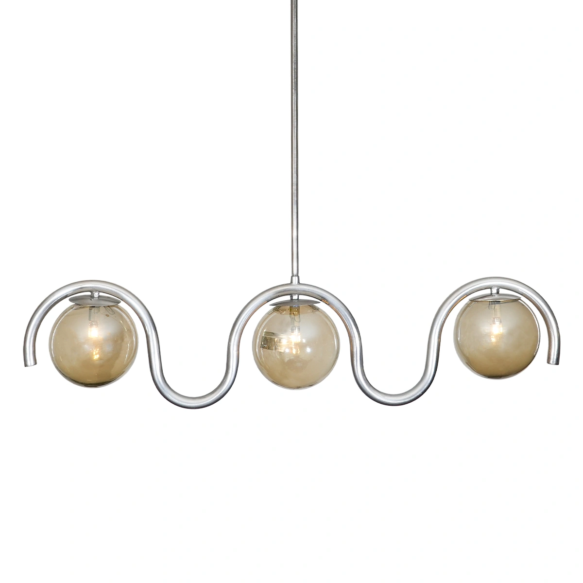 Showcasing gold finish and flowing chrome curves, the Billow chandelier holds three warm glass globes that emit soft, inviting light. its sculptural shape suits dining areas, hallways or living rooms. Pairs seamlessly with other Billow collection pieces for a coordinated look.