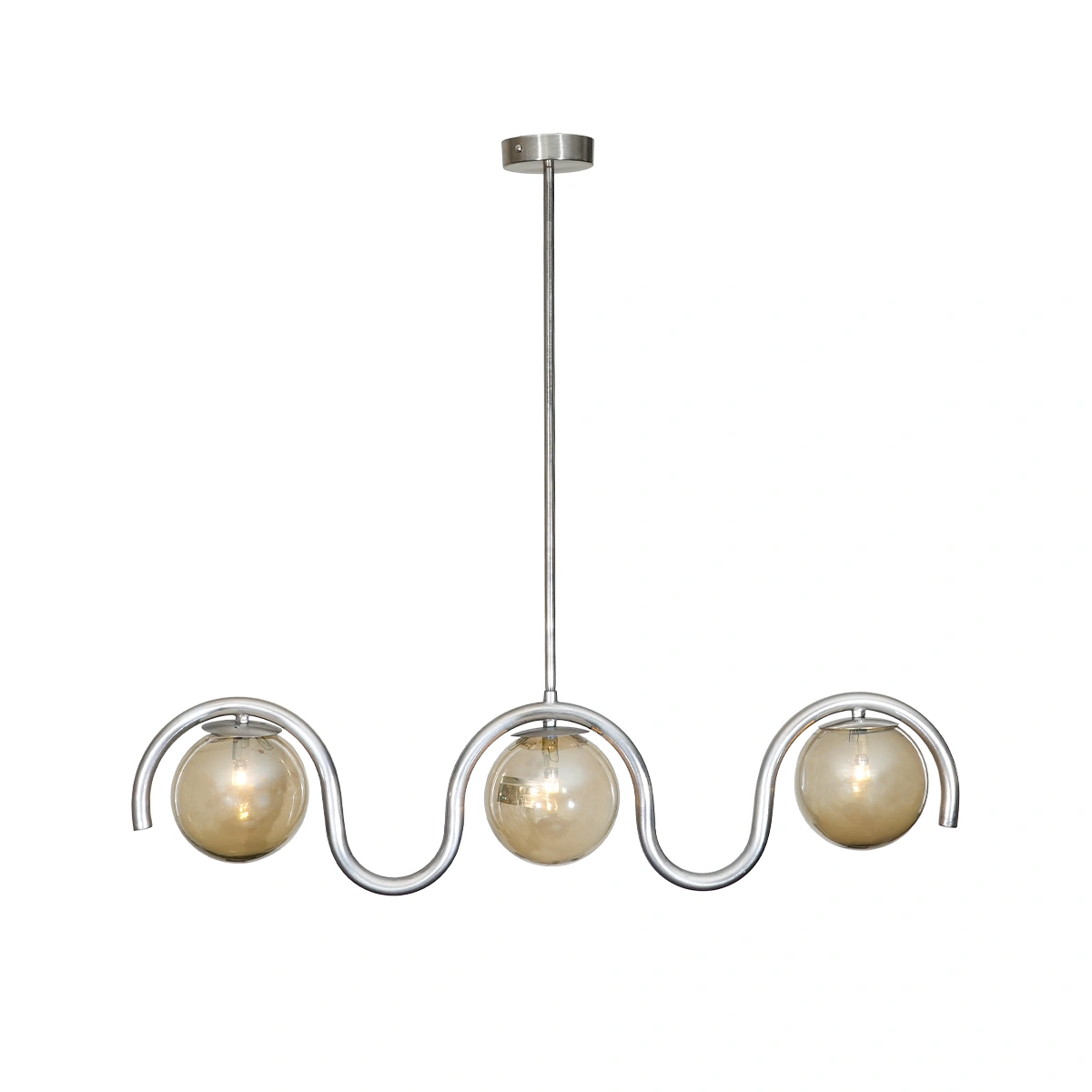 Featuring a gold finish with flowing chrome curves, this chandelier is outfitted with three warm glass globes that emit a soft, inviting light. With a sculptural shape measuring L 83 cm | D 15 cm | H 82 cm, this piece is perfect for dining areas, hallways or living rooms. It's part of the wider Billow Collection, allowing for a beautifully coordinated look.