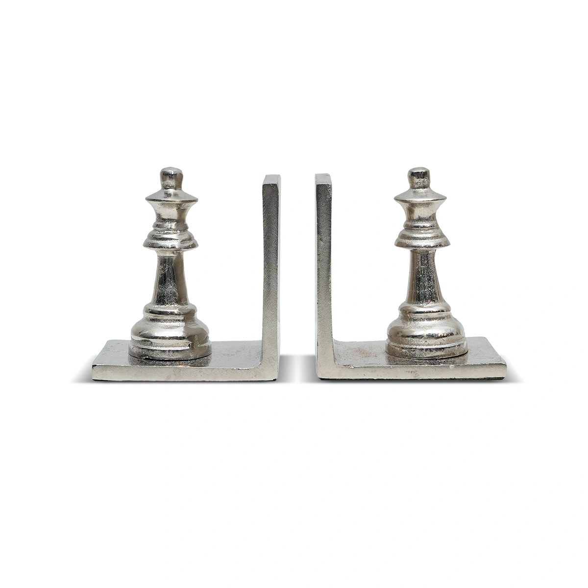 Each set includes two bookends measuring L 25 cm, W 8 cm, and H 22 cm, made from high-quality aluminium with a raw silver finish. Their unique bishop chess piece design stands out, adding an interesting visual element to any space.