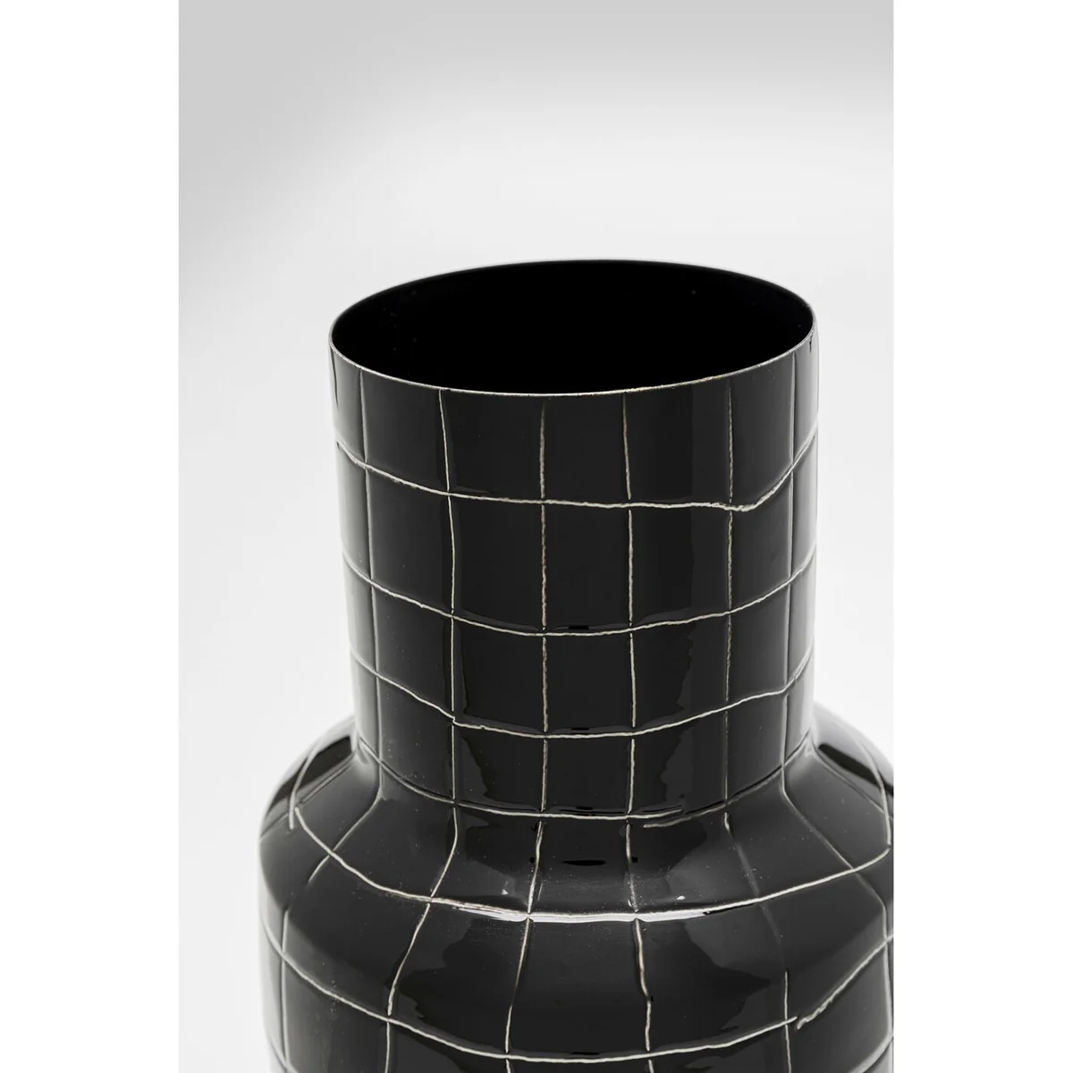 This 33x16x16 cm vase features a fine check pattern in white, lending it a geometric, modern look. The unusual shape is perfect for showcasing bouquets or dry arrangements. Made of enameled steel, it impresses with its shiny surface and robust finish.