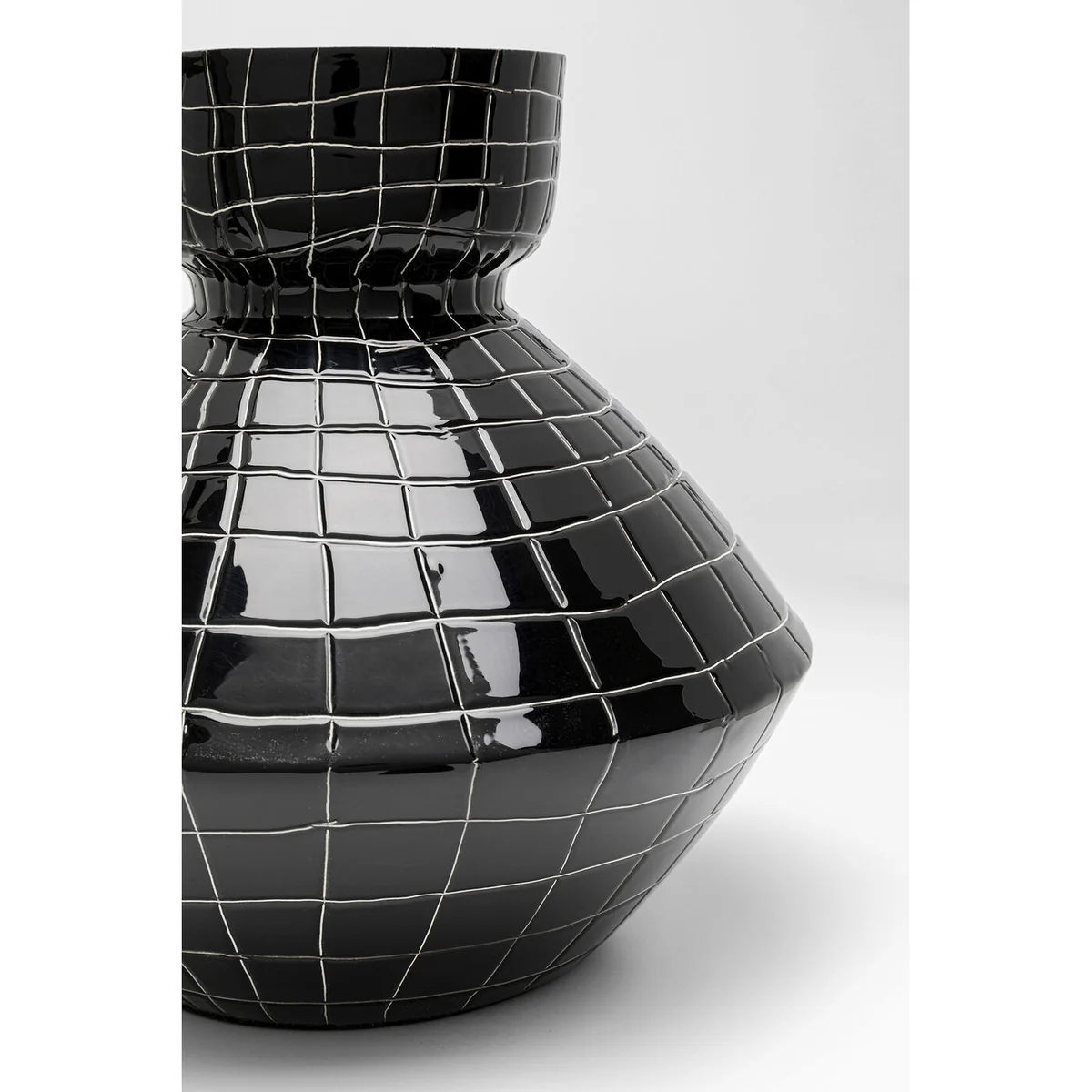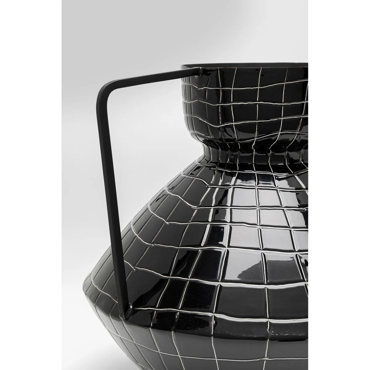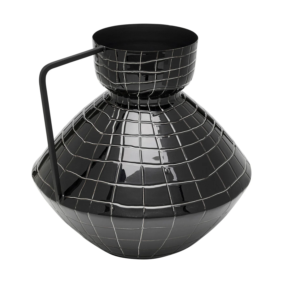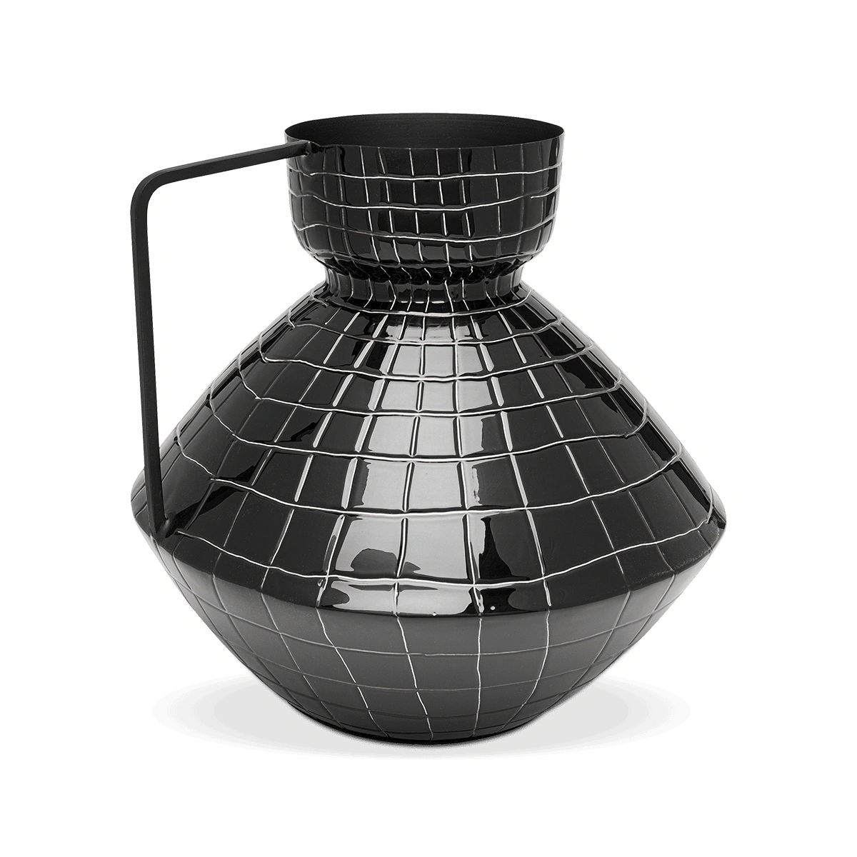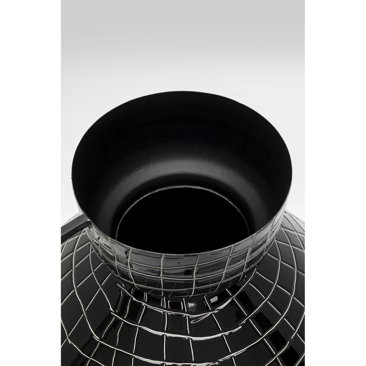 The vase is adorned with a fine check pattern in white, adding a modern geometric look to its glossy black finish. With dimensions of 29 x 30 x 30 centimeters, this design object crafted from enameled steel stands out with its shiny surface and robust finish. The unusual shape of the vase elevates the beauty of bouquets or dry arrangements.