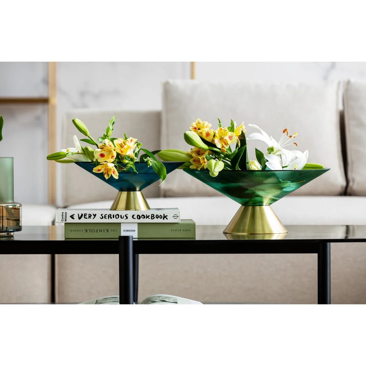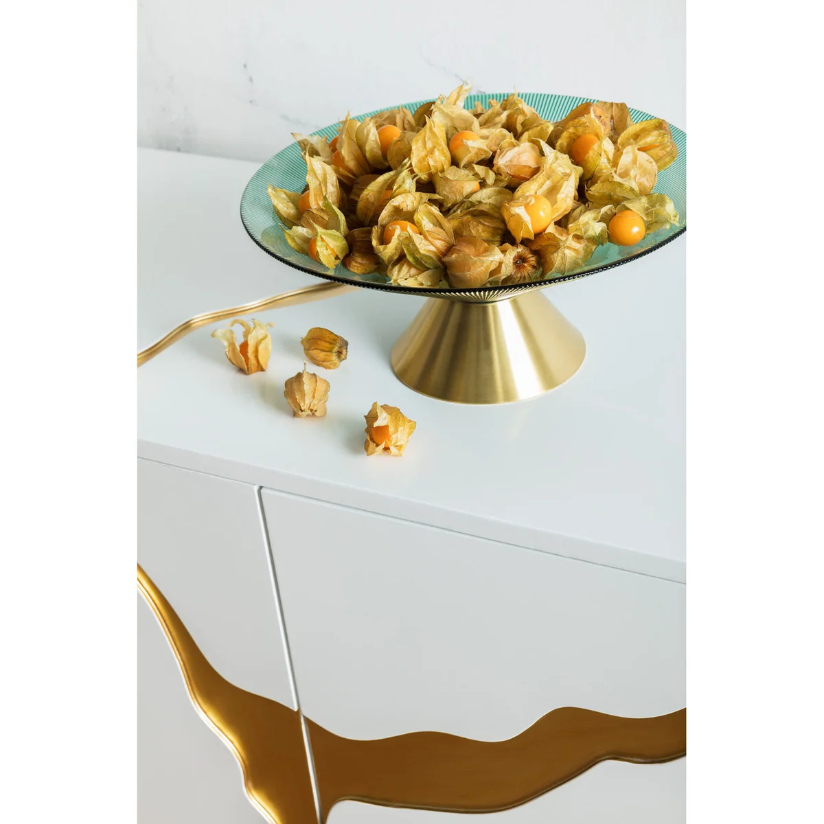 • For flamboyant still lifes: a large glass bowl in exciting blue and with a gold-coloured brass base • Here fruit or flowers are presented more glamorously than ever before • This beauty crowns attractively set tables, sparkles on the kitchen counter or adds the crowning touch to sideboards • In any sunny spot the coloured glass will play with the daylight • A great accessory that will win many hearts on Instagram and Pinterest