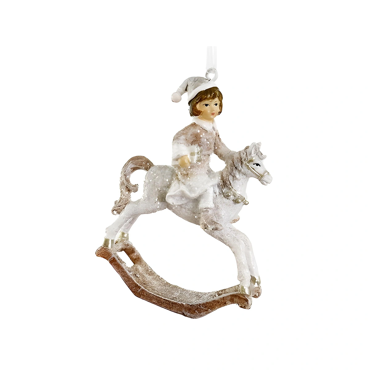 Meticulously crafted from durable polyresin, this ornament stands at a compact 8CM. The gentle boy-on-horse design, coupled with the pristine white color, makes it a versatile addition to any room. Its small size allows for easy placement, even in space-constrained areas.