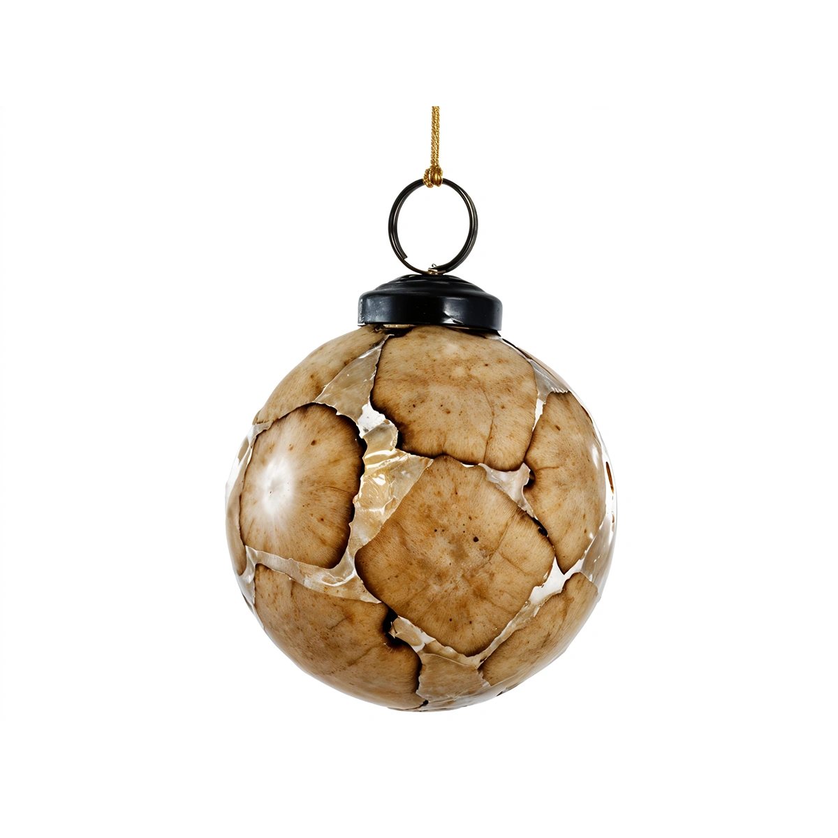 The ornament is crafted from high-quality glass, measuring 7CM in size. Its unique burned paper mosaic design makes it an appealing addition to both metallic and natural elements in your home. The warm brown color brings a touch of earthy elegance.