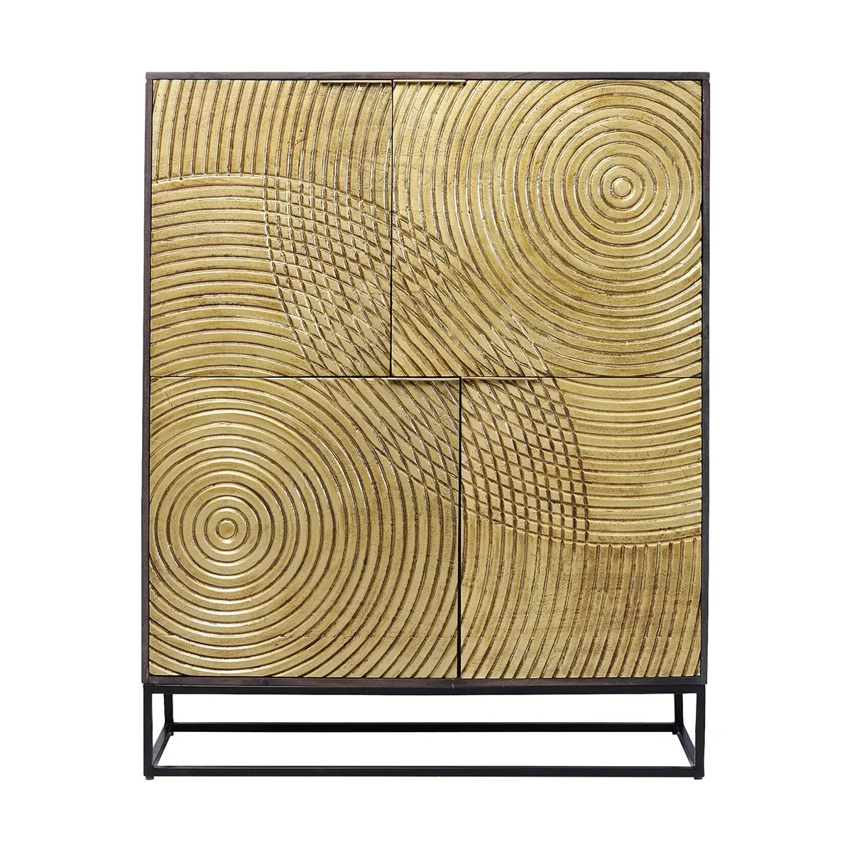 A magical pattern of circles carved into the wood with a fine line. The front of this square cabinet, which stands on a filigree steel frame, looks like a work of art. The four asymmetrically arranged doors with modern push-to-open technology conceal generous compartments for crockery and glasses. A key piece.