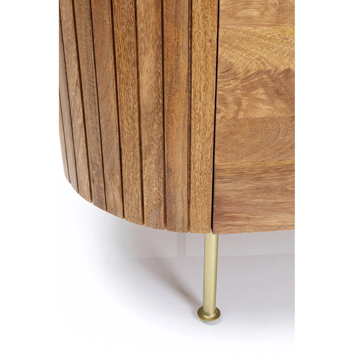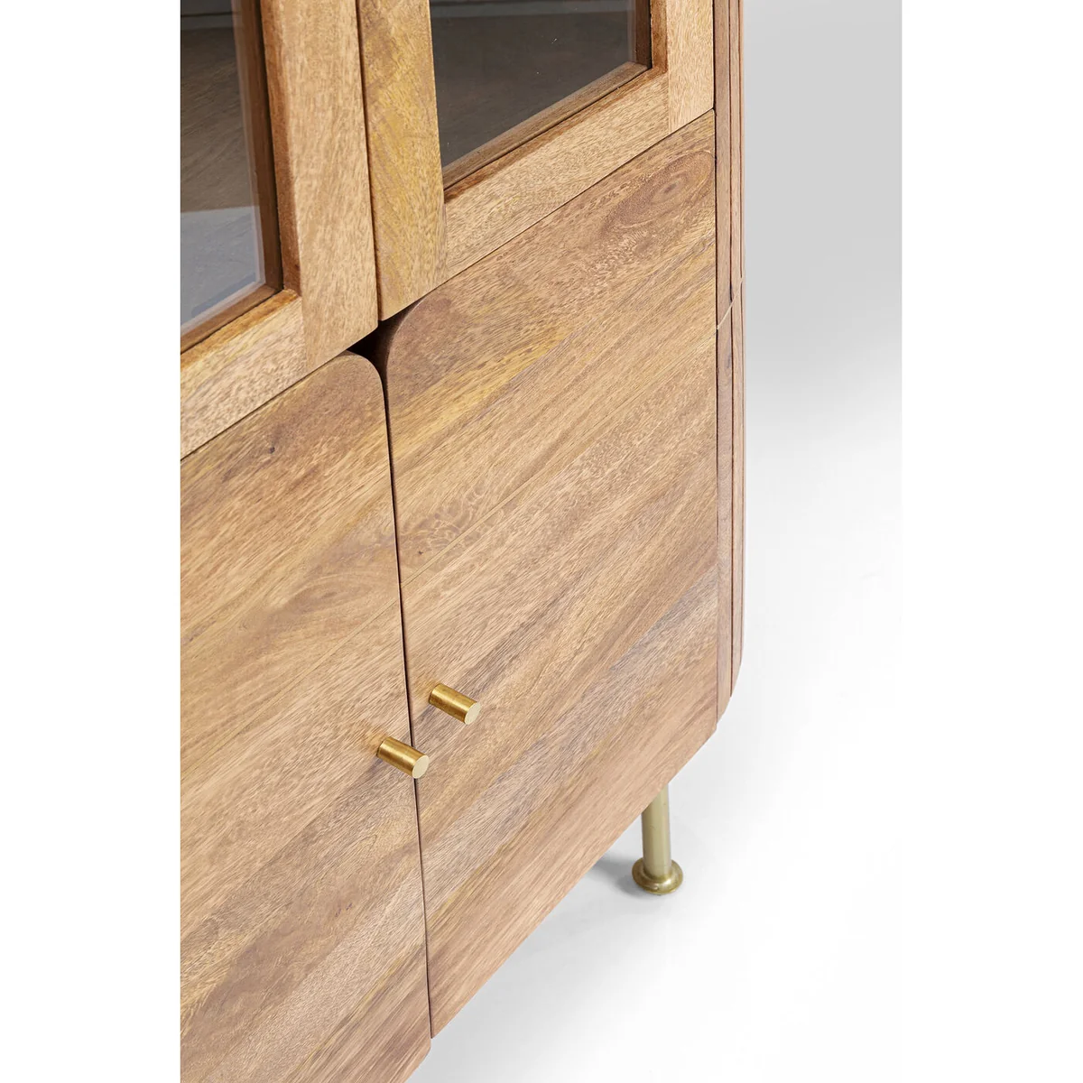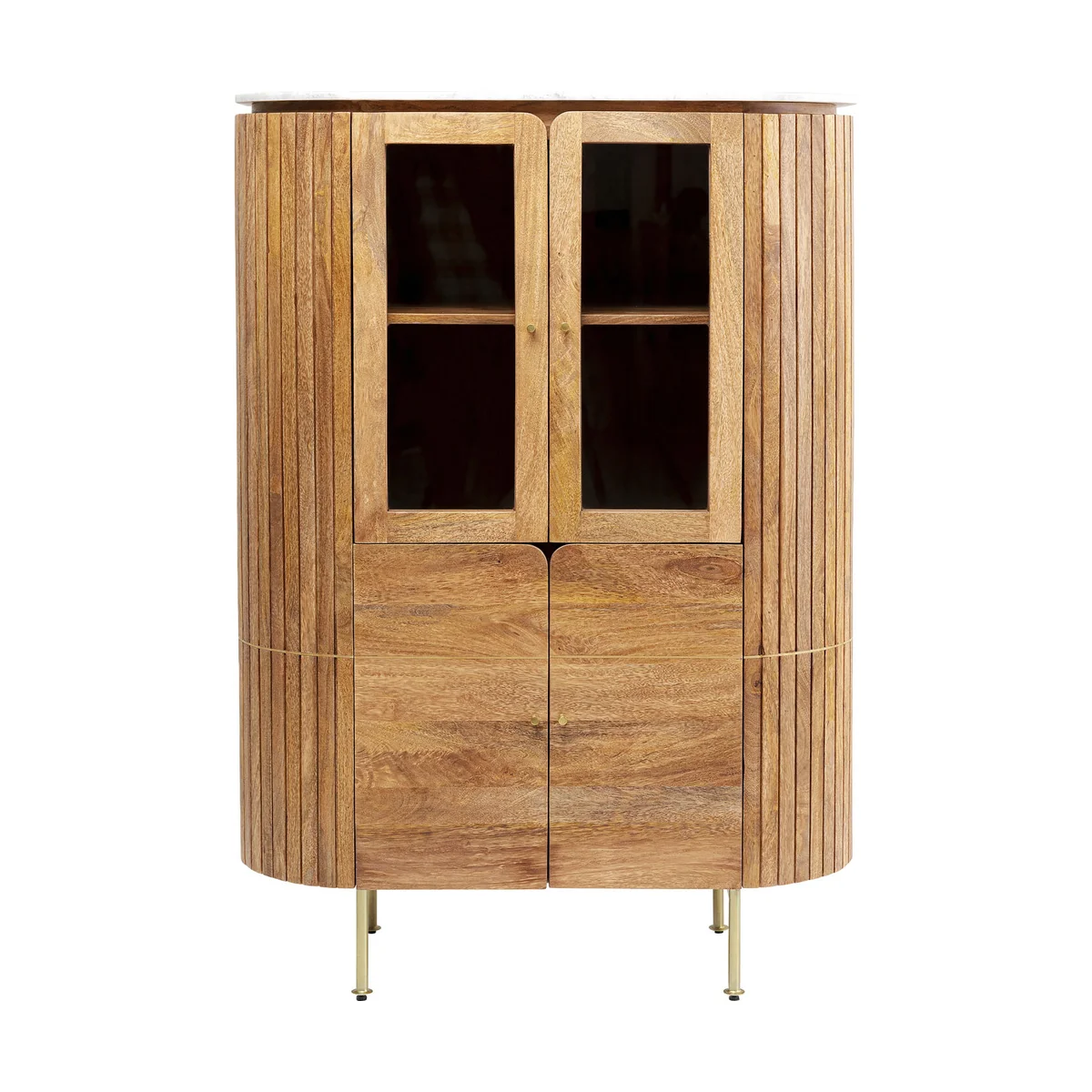 Modern, classy and with a touch of luxury, this cabinet will take your living area to the next level in terms of interior. The combination of processed materials is a spectacle in itself. Made of solid mango wood with a high-quality marble top and golden legs, this living room furniture is brimming with style. The oval shape also adds the finishing touch. Not without reason, the display cabinet is a one-of-a-kind piece thanks to its handcrafted manufacturing and perfectly showcases your wine glasses, bottles and decorative ideas. In the kitchen, living room or dining room: the cabinet is an all-rounder and offers enough space thanks to two doors and four compartments - in addition, the hinges are adjustable.