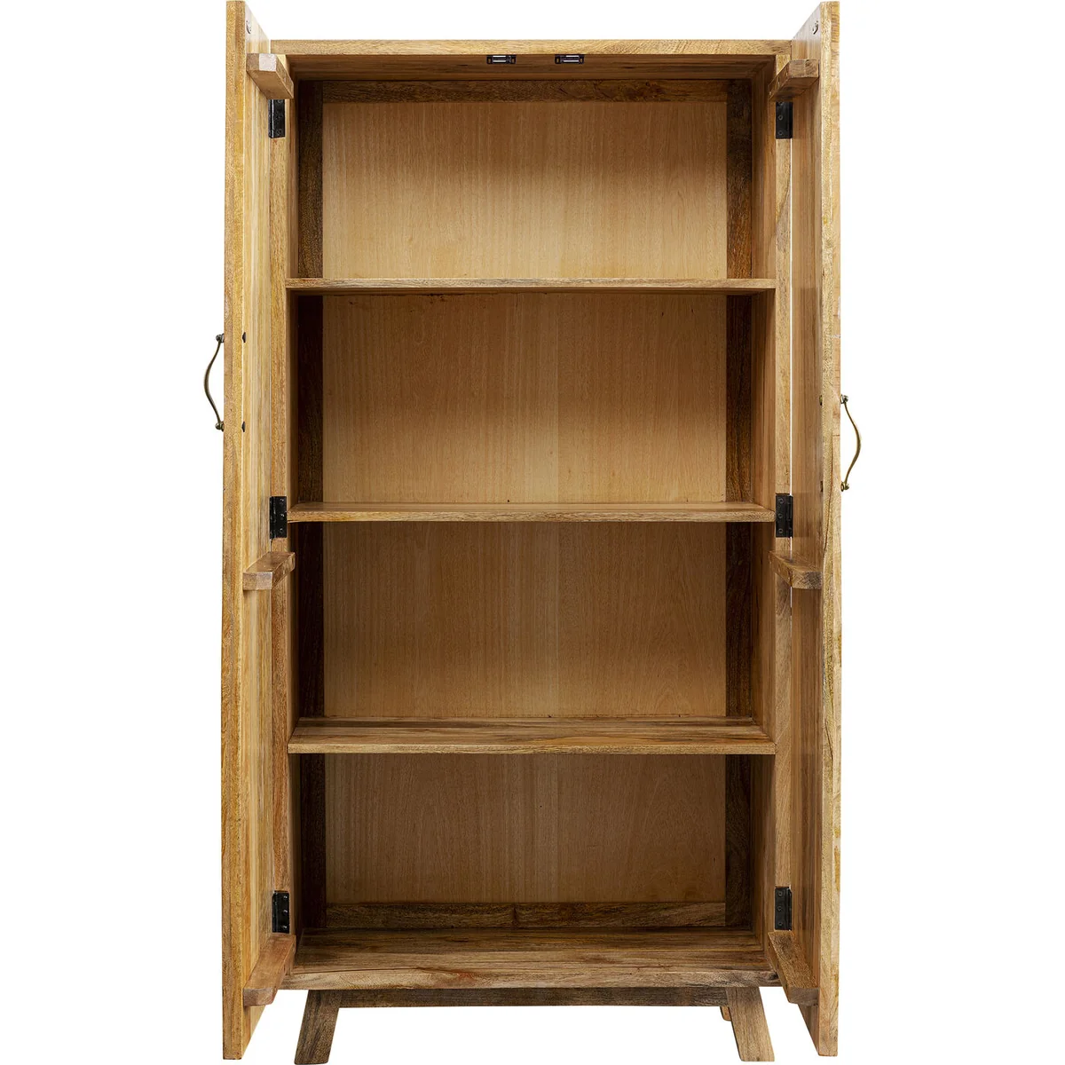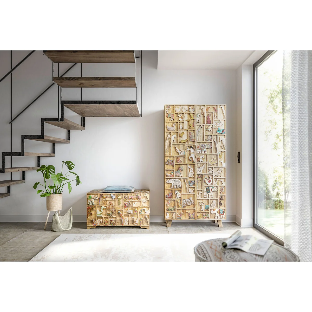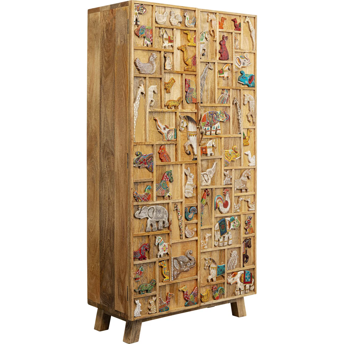 This small wardrobe is both a decorative and functional solution for storing things in your household, whether in the hallway, bedroom or living room. Each one is made from solid mango wood and is crafted and painted by hand at traditional workshops in India. The doors, the body, the feet and the animal figures are made of solid wood. With attention to detail, e.g. the rabbit, elephant and giraffe have been artistically carved and colourfully painted. The powder-coated steel fittings in matt brass complement the design stylishly. Three fixed shelves create plenty of storage space and storage areas. The uses of the wooden cupboard are many: use it as a charming organiser in the hall, as a linen cupboard or for living room storage. The solid construction and the natural material of wood make this piece of furniture particularly durable.