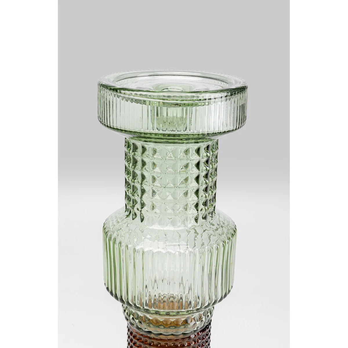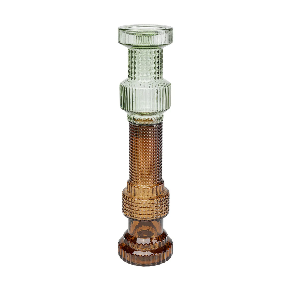 • A tall candlestick made of differently coloured and embossed glass in green and brown for pillar candles • A glass object as if from the workshop of an artist, which plays with geometric shapes and structures • Objects made of coloured glass represent the new lightness in decorating • Available in other colours and as vases - especially attractive when arranged in a group