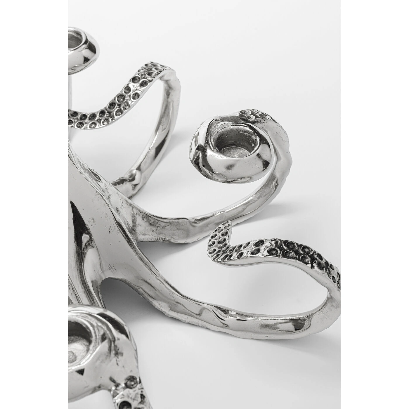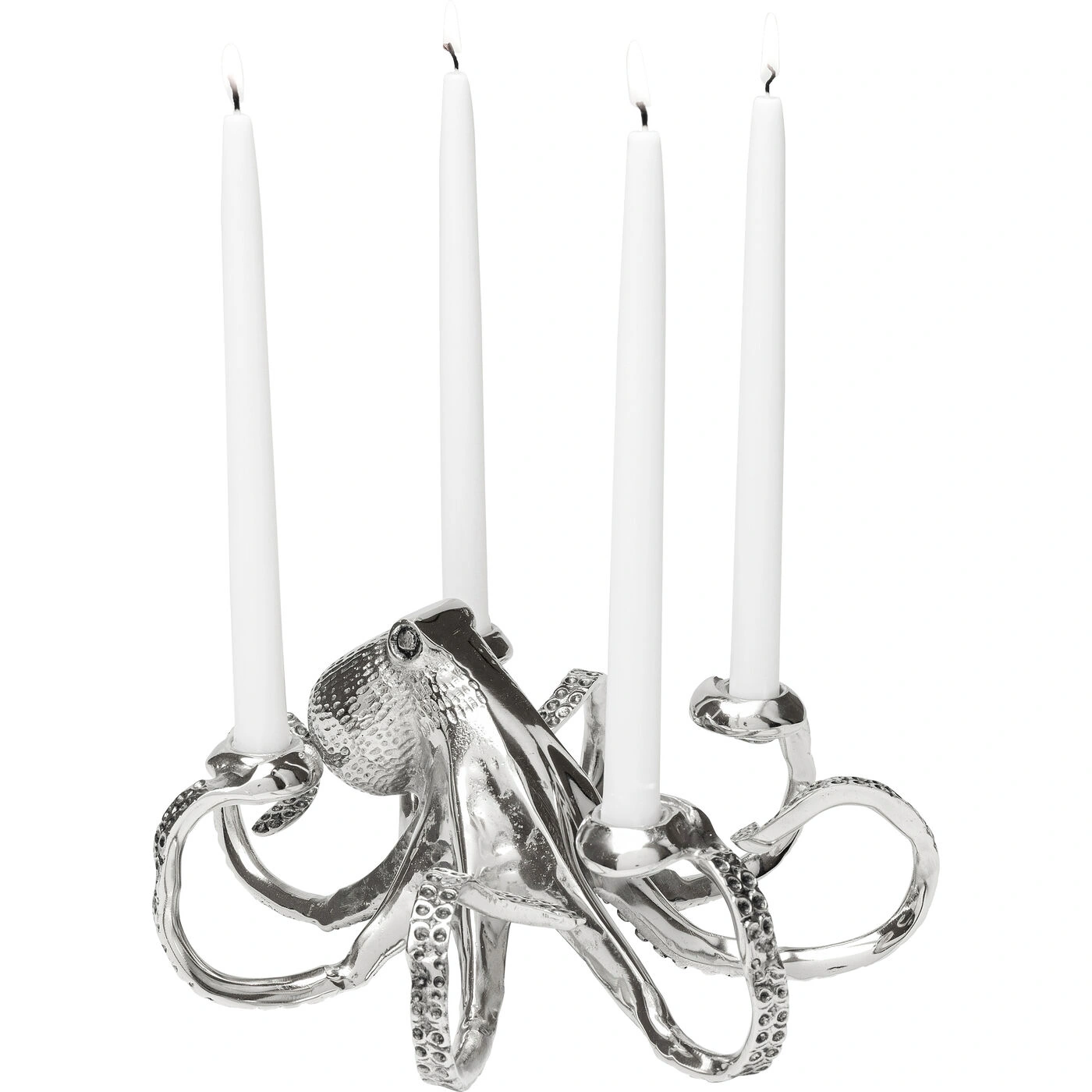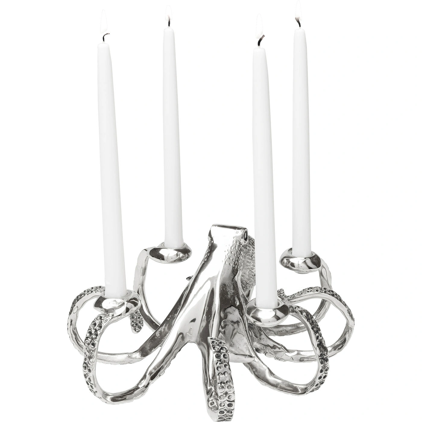 ● A shimmering silvery candelabra in the shape of an octopus with holders for four candles